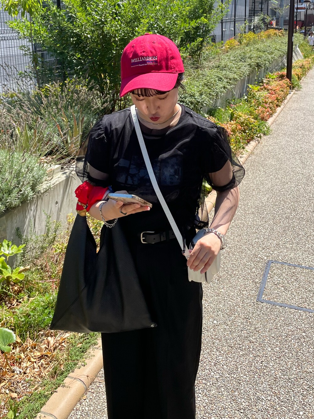 オールブラックに差し色の赤キャップ💞 シアートップスを重ね着して一癖加えてみました✨