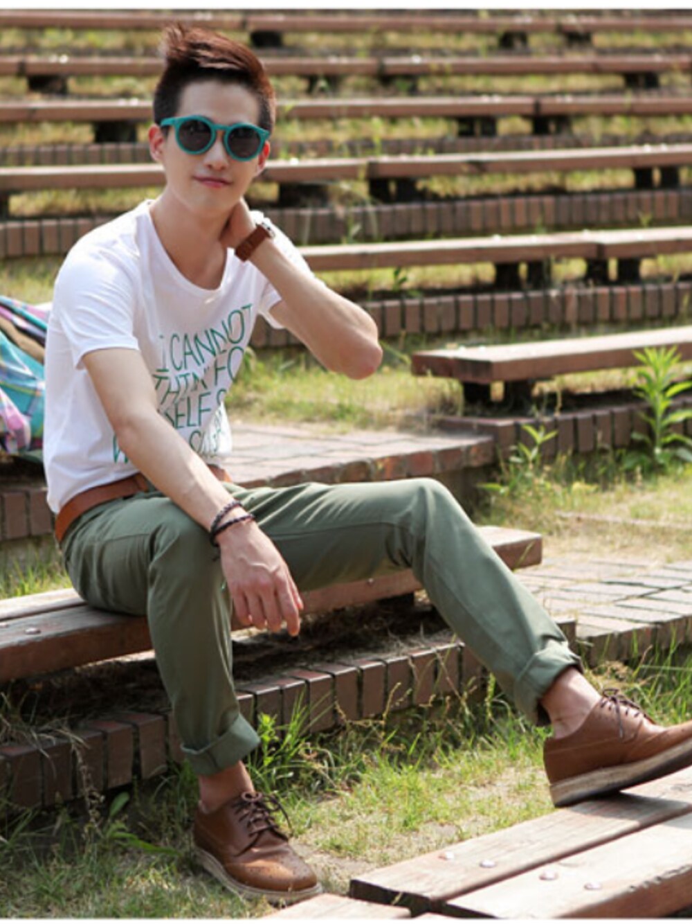 グリーン系のTシャツ/カットソーを着用したメンズの夏コーディネートの1枚目の写真