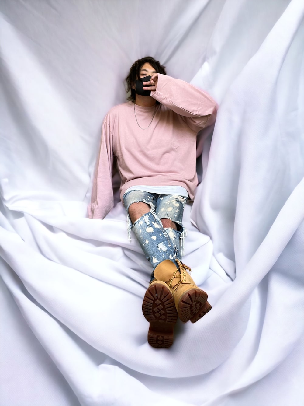 ピンク系のTシャツ/カットソーを着用したメンズの秋コーディネートの1枚目の写真