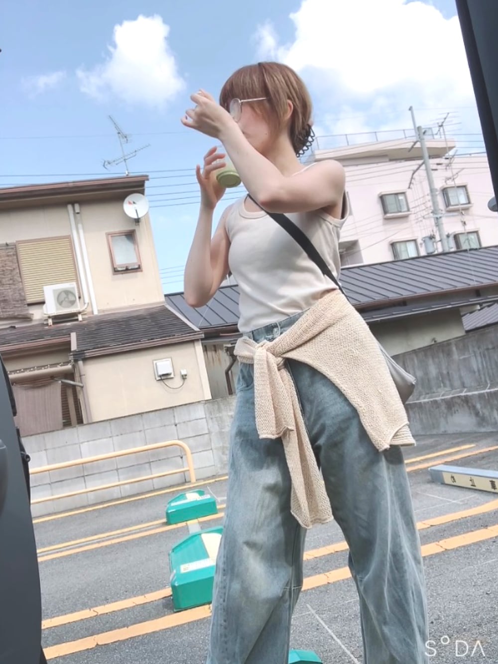 ブルー系のデニムパンツを着用したレディースの夏コーディネートの3枚目の写真