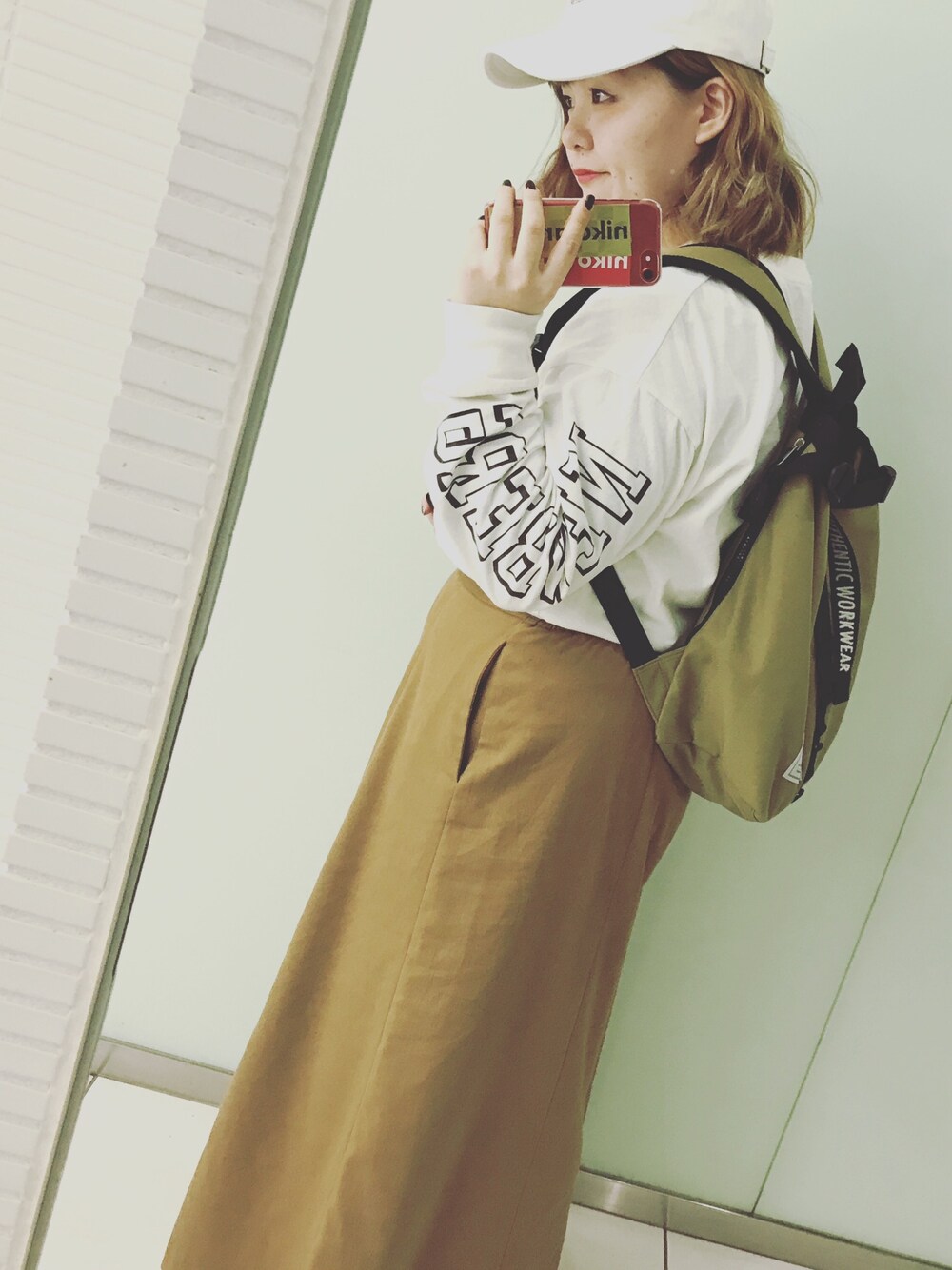 だいぶUP遅くなってしまいました、、 髪切る前のコーデ!!! ロンTのロゴが凄く可愛い!! チノカラーでカジュアルストリートに☺︎