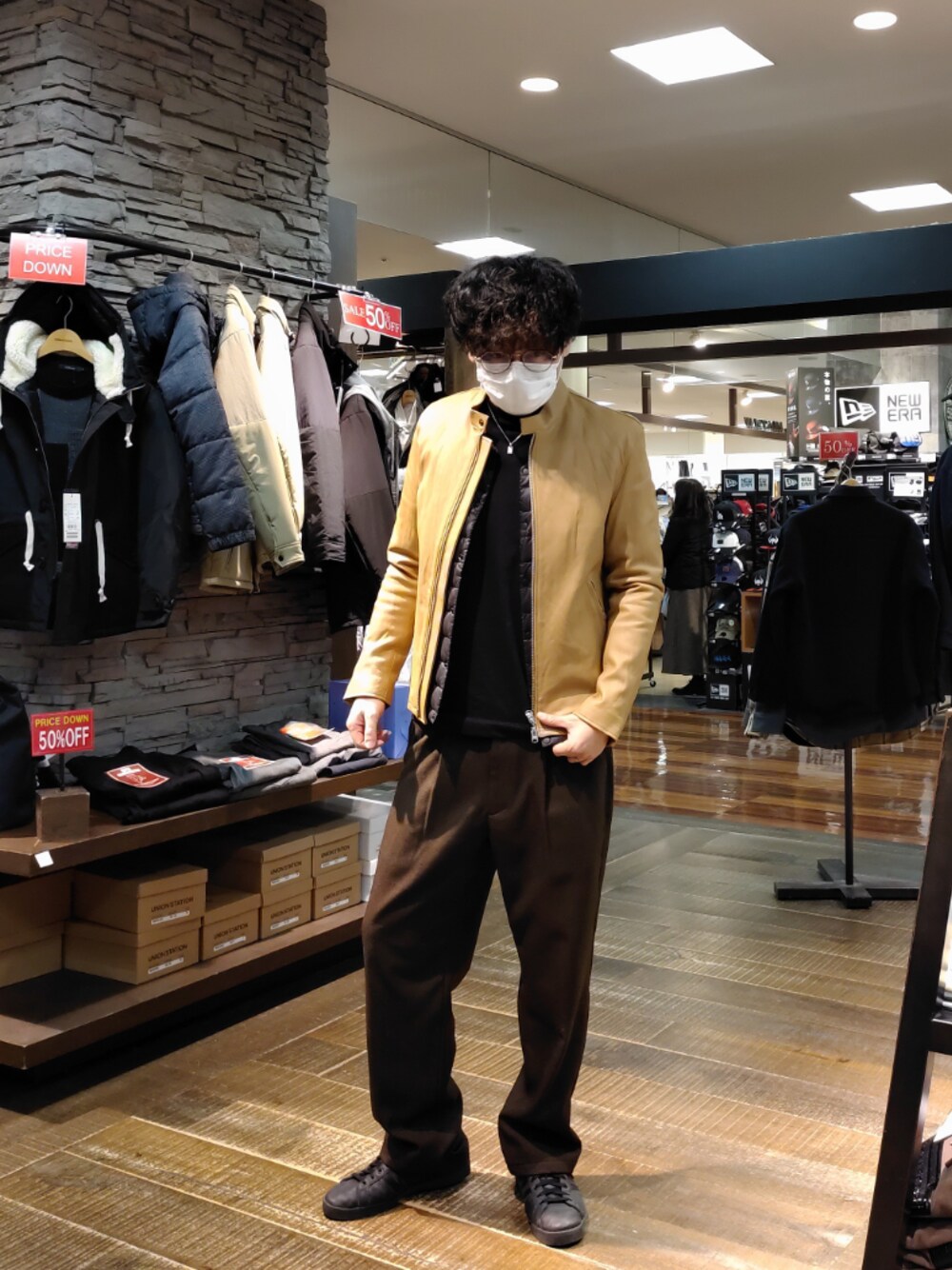 黄色に見える ベージュのシングルライダースジャケット 中にはUNIQLOのインナーダウン インナーダウンは最強ですね 背中穴あいてます 茶系と黒でまとめました