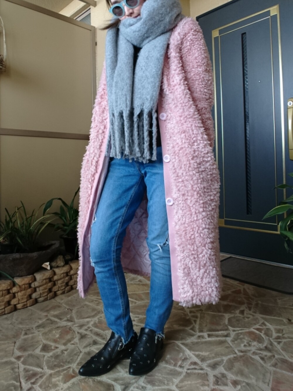 激安だったピンクのアウター❤️ ちょっと薄手なのでZARAのマフラーで ぬくぬくをプラス
