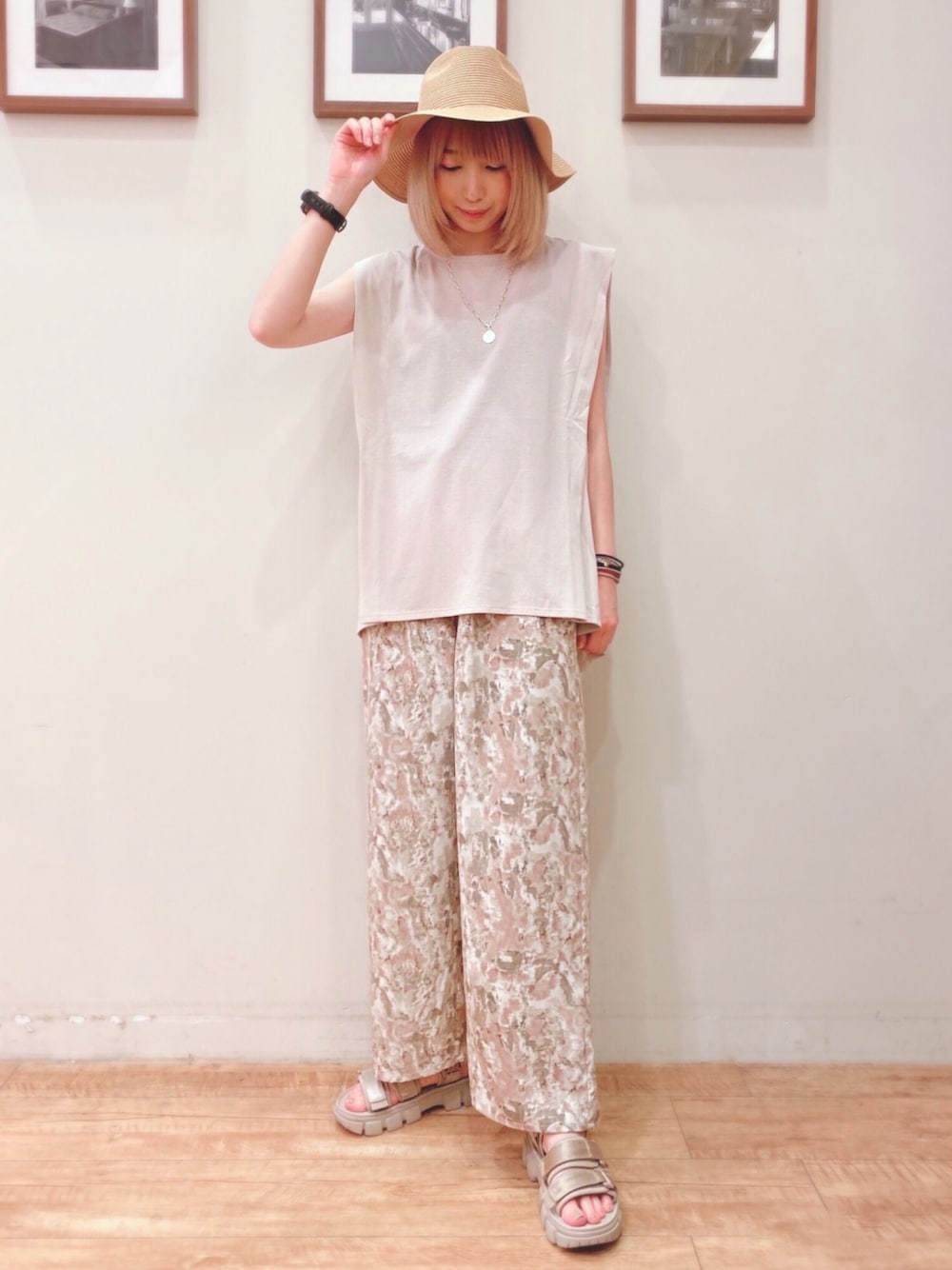 おはようございます、 ご覧いただきありがとうございます★ いいね、お気に入りありがとうございます。 ベージュトップス×ニュアンス柄パンツのコーディネートです! トップスは肩のタックでノースリーブでも二の腕がスッキリ見えます! パンツは今年らしいニュアンス柄で、シンプルにTシャツと合わせるだけでオシャレに着れます♪ WORLD online Storeにも沢山のコーディネートを載せてます♪ →プロフィールの🖥をチェック👈