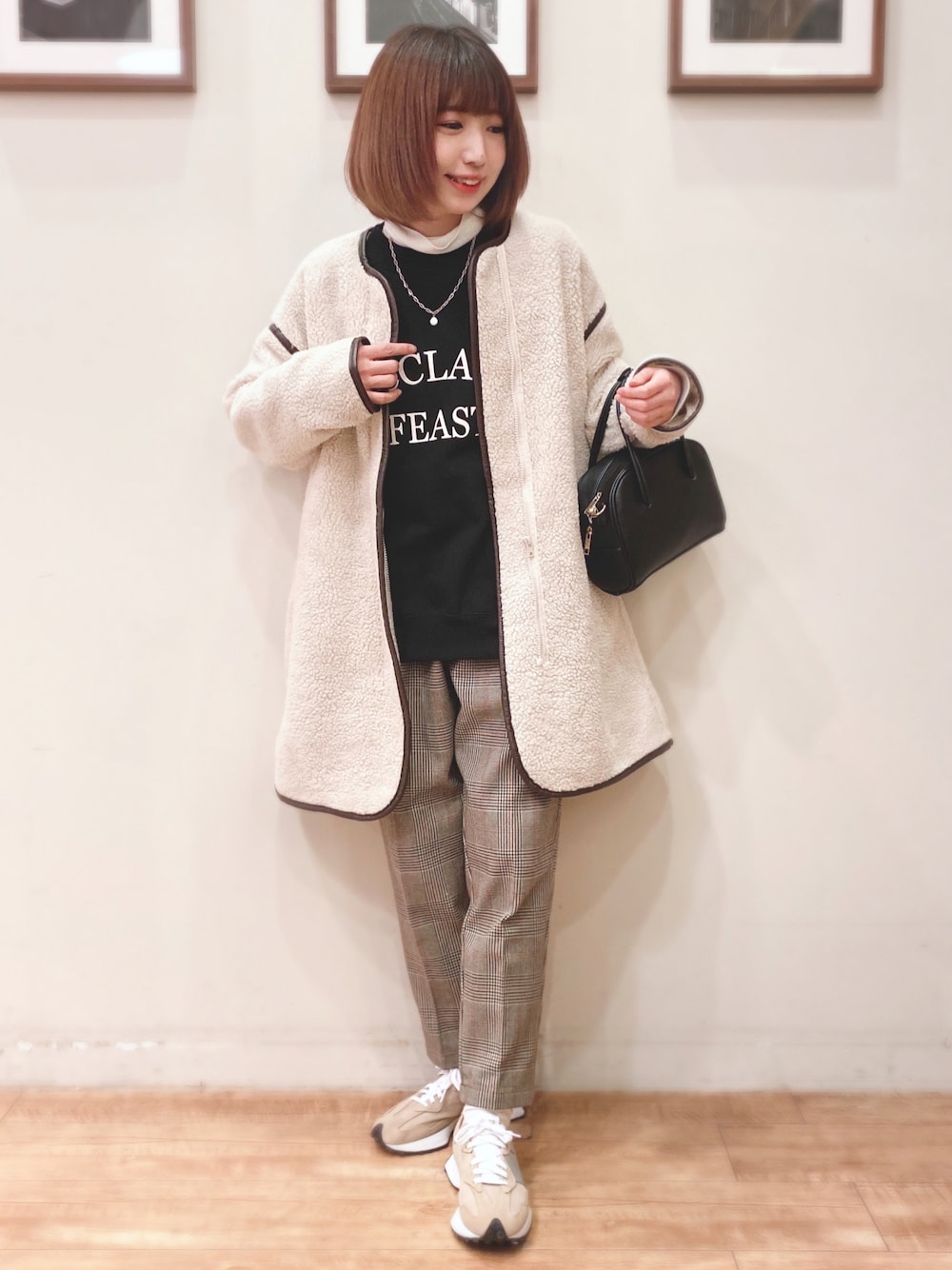 おはようございます、 ご覧いただきありがとうございます★ いいね、お気に入りありがとうございます🙏✨ フォルダインもとっても嬉しいです😊 ボアコート×ロゴスウェット×チェック柄パンツのカジュアルコーデです♬ コートはパイピング使いがアクセントになっているボアコートです! すっきりとしたノーカラーでハイネックのトップスとの相性◎🙆♀️✨ ドロップショルダーでゆったりとしたシルエットなので、厚手のインナーとも合わせられます👍 トップスは裏毛起毛素材を使用したドルマンプルオーバーです! 今年らしいオーバーサイズで、雰囲気たっぷりなシルエットに仕上がっています🖤 フロントのロゴプリントも目を引くポイントになります! パンツはボンディング加工されたテーパードパンツです! 風を通しにくく、冬に向けてオススメです👌 ウエストは後ろがゴムで楽ちんです♬ WORLD online Storeにも沢山のコーディネートを載せてます♪ →プロフィールの🖥をチェック👈