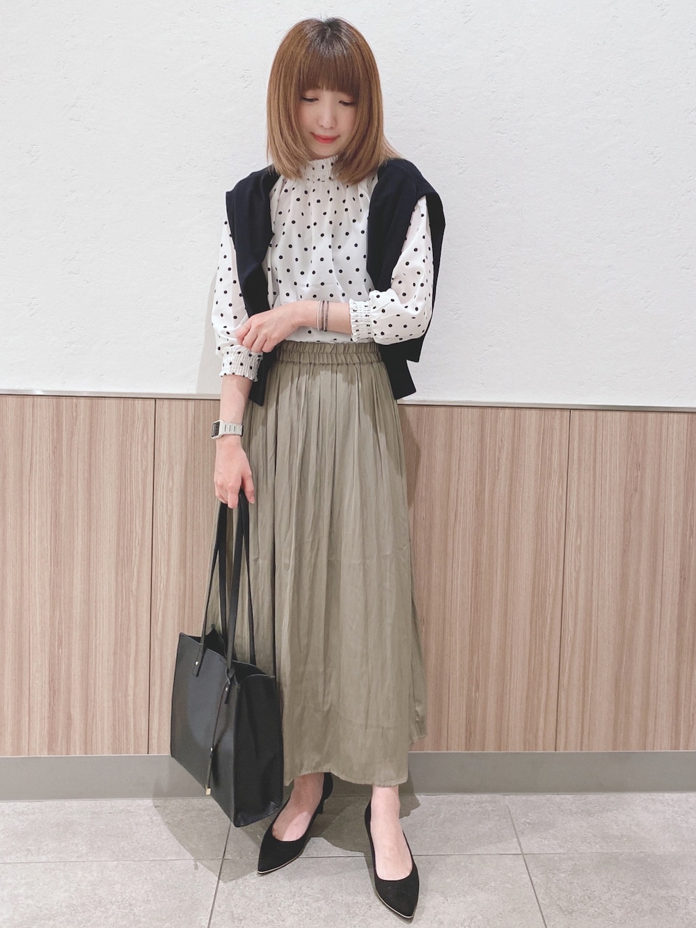 こんにちは、 ご覧いただきありがとうございます★ いいね、お気に入りありがとうございます🙏✨ フォルダインもとっても嬉しいです😊 ドット柄ブラウス×カーディガン× サテンギャザースカートのコーディネートです♬ ブラウスは大きめのドット柄が可愛いブラウスです! 首元と袖口のギャザーデザインがフェミニンな印象です。 今年らしいボリューム袖×程よく高さのあるスタンドネックがポイントになっています。 肩がけのカーディガンは着回しやすさ重視のシンプルなデザインで着回し抜群な一枚です! 目の詰まったしなやかな編地なのできれい見え◎ スカートはトレンドのサテン素材のギャザースカートです! たっぷり入ったギャザーでボリューム感のあるシルエットがオシャレな一枚です。 すとんと落ち感のある素材で、カジュアルすぎずキレイ見え◎ ウエストはゴム仕様で楽ちんな履き心地です。 WORLD online Storeにも沢山のコーディネートを載せてます♪ →プロフィールの🖥をチェック👈