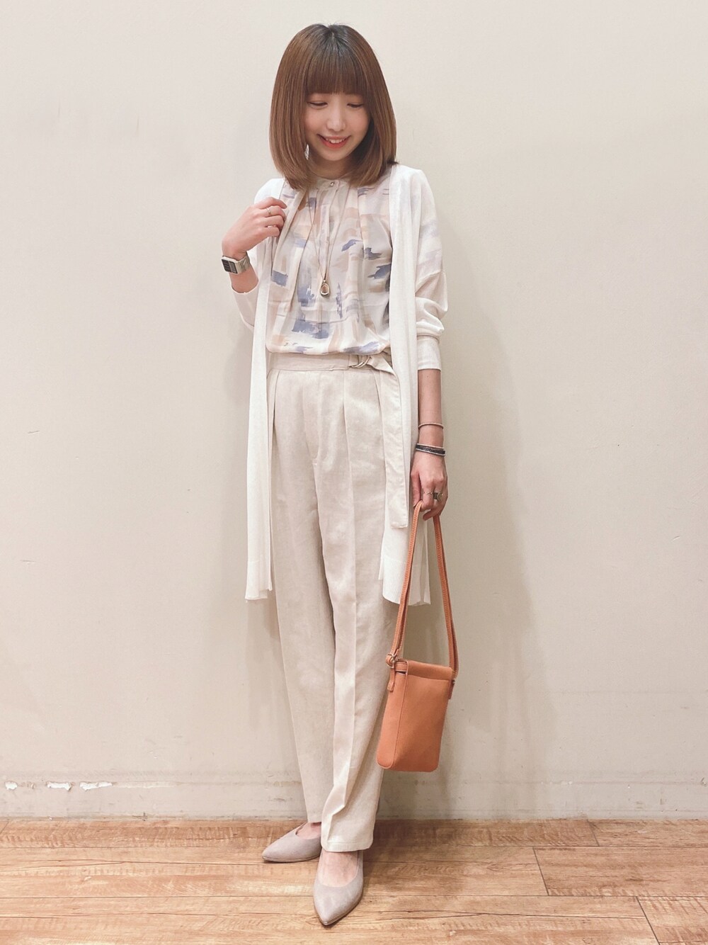 おはようございます、 ご覧いただきありがとうございます★ いいね、お気に入りありがとうございます🙏✨ フォルダインもとっても嬉しいです😊 アートプリントブラウス×カーディガン×テーパードパンツのコーディネートです♬ ブラウスはネックに金ボタンを使用し、エレガンスな印象のブラウスです! 通勤や、ちょっとしたお出かけにも◎ 大胆なアートプリントがオシャレです。 カーディガンはヒップまわりをカバーできるロング丈のショールカーディガンです! 軽くてさらっとした着心地で、夏の冷房対策や日焼け防止に重宝しそうです。 程よいシアー感が涼し気な印象に◎ パンツは麻混のシャリ感のある素材で、楽に穿いていただけるテーパードパンツです! ゆるめのテーパードシルエットが今年らしく、ウエストのベルト風ディテールがデザインポイントになっています。 センタープレスが入っているので、キレイめコーデにピッタリです。 WORLD online Storeにも沢山のコーディネートを載せてます♪ →プロフィールの🖥をチェック👈