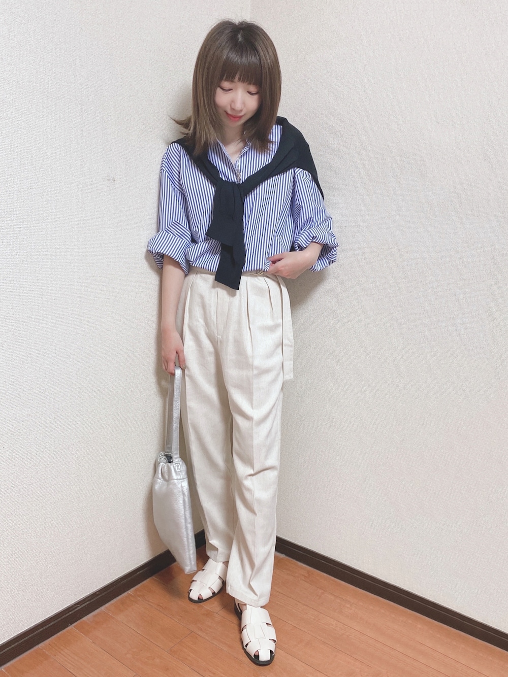 おはようございます、 ご覧いただきありがとうございます★ いいね、お気に入りありがとうございます🙏✨ フォルダインもとっても嬉しいです😊 ストライプシャツ×テーパードパンツのコーディネートです♬ トップスは女性らしいバンドカラーチュニックシャツです! カジュアルなルックスながら、合わせるボトムによって綺麗めにも着れます。 ゆったりシルエットで、体型カバーも◎ 肩がけのカーディガンは着回しやすさ重視のシンプルなデザインで着回し抜群な一枚です! 目の詰まったしなやかな編地なのできれい見え◎ パンツは麻混のシャリ感のある素材で、楽に穿いていただけるテーパードパンツです! ゆるめのテーパードシルエットが今年らしく、ウエストのベルト風ディテールがデザインポイントになっています。 センタープレスが入っているので、キレイめコーデにピッタリです。 WORLD online Storeにも沢山のコーディネートを載せてます♪ →プロフィールの🖥をチェック👈