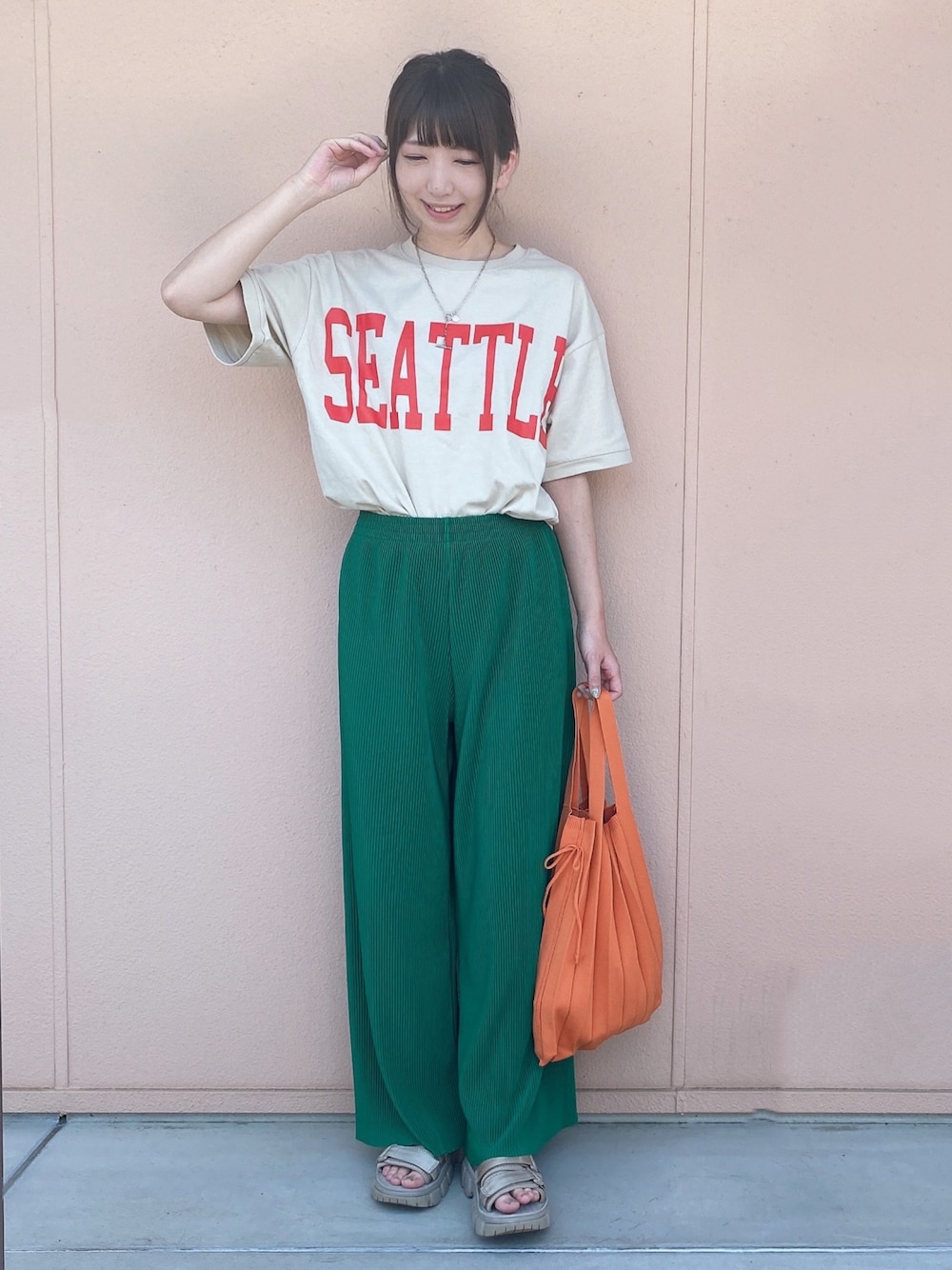 こんにちは、 ご覧いただきありがとうございます★ いいね、お気に入りありがとうございます🙏✨ フォルダインもとっても嬉しいです😊 カレッジBIGロゴTシャツ×プリーツパンツのコーディネートです♬ トップスはロゴが目を惹くコットン100%で仕立てたTシャツです! ショルダー位置が低めのデザインで、ゆったりとしたシルエットで着やすいです。 パンツは細プリーツが綺麗で歩く度に揺れる軽やかな素材のカラープリーツパンツです! 程よい分量感のあるシルエットに、ウエストはゴム仕様で着心地も楽ちんです。 WORLD online Storeにも沢山のコーディネートを載せてます♪ →プロフィールの🖥をチェック👈