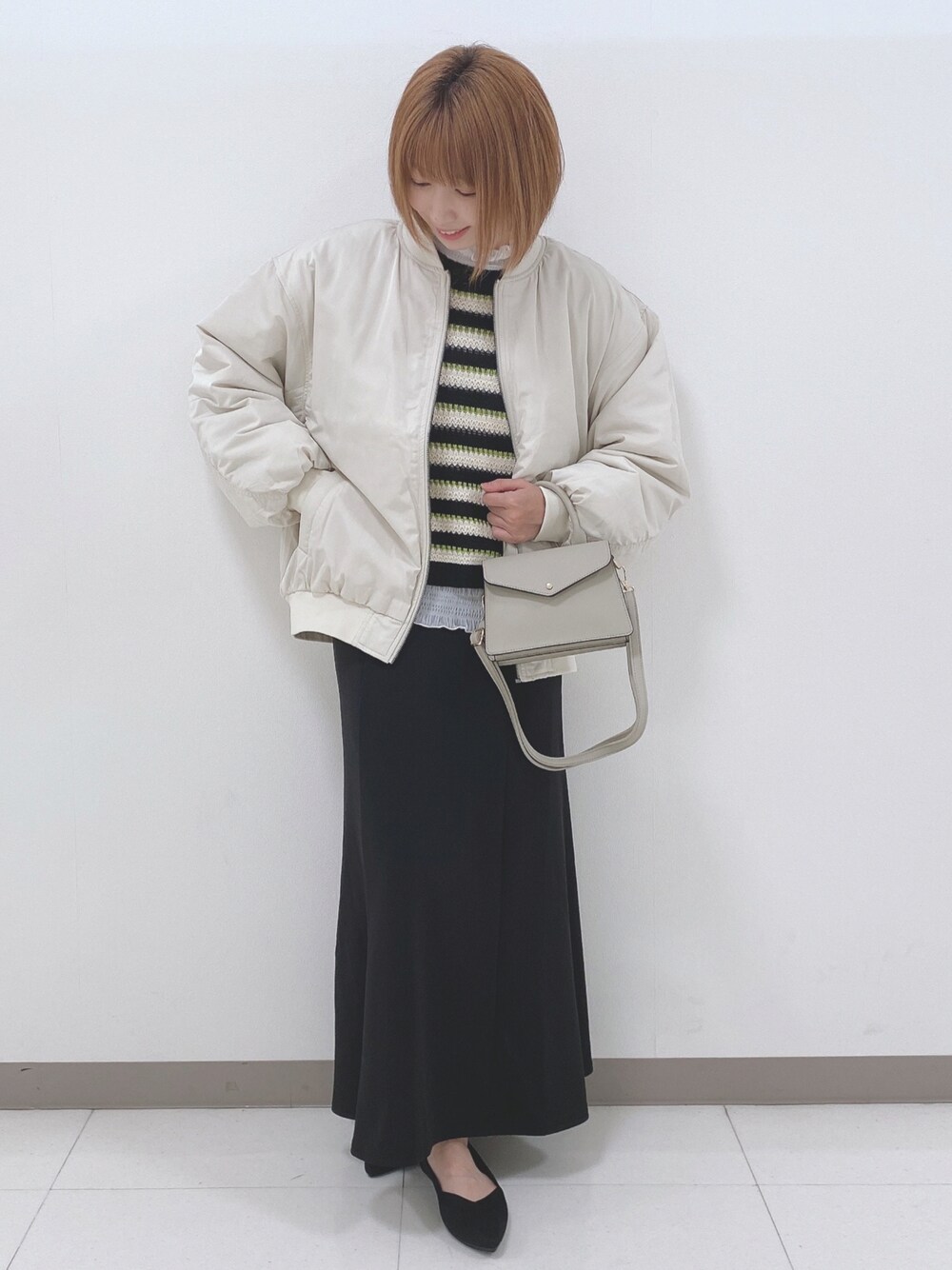 おはようございます、 ご覧いただきありがとうございます★ いいね、お気に入りありがとうございます🙏✨ フォルダインもとっても嬉しいです😊 中綿MA-1× 透かし編みマルチボーダーニットプルオーバー× メイドスカートのコーディネートです♬ アウターは裏面に中綿をキルティングした、冬に嬉しいデザインのMA-1です! ダイヤ型のキルティングは、脱いだ時にも可愛いポイントに◎ BIGシルエットでゆったりと着られるので、トップスのシルエットを選ばずコーディネートの幅が広がるアイテムです。 インナーは程よい透け感とマルチボーダーの組み合わせが可愛いニットプルオーバーです! トレンドのマルチカラー配色がアクセントになっていてコーデの主役にぴったりな1枚です。 少し短めな着丈とゆたっりとしたサイズ感でレイヤードもしやすくなっています。 スカートは気軽に穿けるジャージ素材のマーメイドスカートです! ウエストもゴムで楽ちんです。 しなやかな落ち感も女性らしく、おすすめポイントです。 WORLD online Storeにも沢山のコーディネートを載せてます♪ →プロフィールの🖥をチェック👈