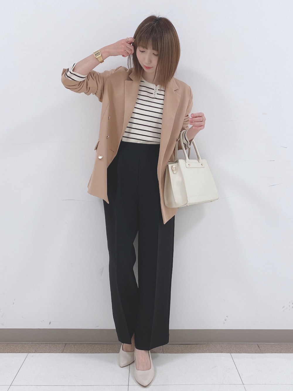こんばんは、 ご覧いただきありがとうございます★ いいね、お気に入りありがとうございます🙏✨ フォルダインもとっても嬉しいです😊 ・・・・・・・・・・・・・・・・・ オフィスカジュアル♪ ・・・・・・・・・・・・・・・・・ 🤎ゴールド釦ダブルテーラジャケット 🎹パ-ル調デザインラウンドネックニット 🖤サイドタブ付きストレッチワイドパンツ ジャケット♡ 大人かっこいい!クラシックなダブルテーラージャケット。 着丈も長めでメンズライクに着こなせるゆったりシルエット。 ゴールドボタンがアクセントのダブルジャケット。 スカートにもパンツにも合わせやすいデザイン。 ONスタイルできれいめに、OFFスタイルでデニムなどを合わせてカジュアルにも着られて幅広く活躍する一着です。 ニット♡ パール調ボタン使いが目を惹く、フェミニンなニット。ほどよく細身のシルエットで、ウエストインですっきり上品に合わせて頂けるアイテムです。 パンツ♡ ウエストのタブデザインがポイントのワイドパンツ。 センタープレス入りで脚長効果◎ ウエスト後ろはゴム仕様で楽に穿けるのにすっきりとキレイ目なシルエットです。 WORLD online Storeにも沢山のコーディネートを載せてます♪ →プロフィールの🖥をチェック👈