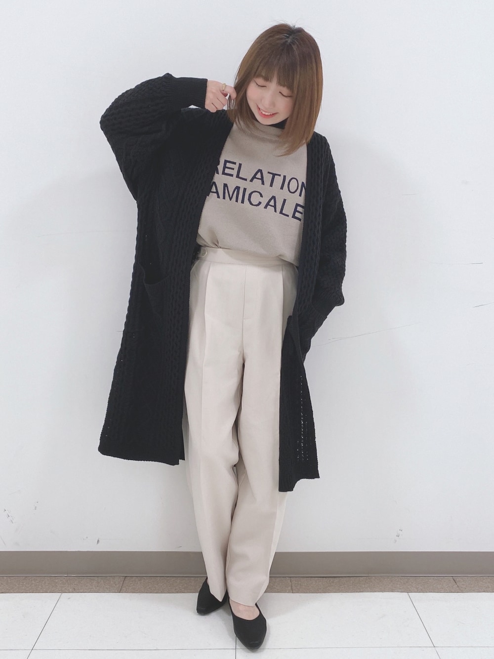 こんばんは、 ご覧いただきありがとうございます★ いいね、お気に入りありがとうございます🙏✨ フォルダインもとっても嬉しいです😊 ・・・・・・・・・・・・・・・・・ 大人カジュアル♪ ・・・・・・・・・・・・・・・・・ 🖤ケーブル柄ロングカーディガン 🧸スウェットライク ロゴニット 🤍サイドタブ付きストレッチワイドパンツ カーディガン♡ 立体的でざっくりとした編地がかわいいケーブル柄ニットカーディガンです! 身体をおおい、縦長ラインを強調できるので体型カバーにも◎ 幅広い着こなしにマッチし、デイリー使いにおすすめのアイテムです。 ニット♡ 一枚で着映えする、ロゴニット。 オーバーサイズシルエットで、着るだけでこなれて見えます。 スウェットとは違う価値観があり上品にみえるので、カジュアルコーデ以外にもスカートなどのフェミニンコーデのアクセントにもおすすめです。 パンツ♡ ウエストのタブデザインがポイントのワイドパンツ。 センタープレス入りで脚長効果◎ ウエスト後ろはゴム仕様で楽に穿けるのにすっきりとキレイ目なシルエットです。 WORLD online Storeにも沢山のコーディネートを載せてます♪ →プロフィールの🖥をチェック👈