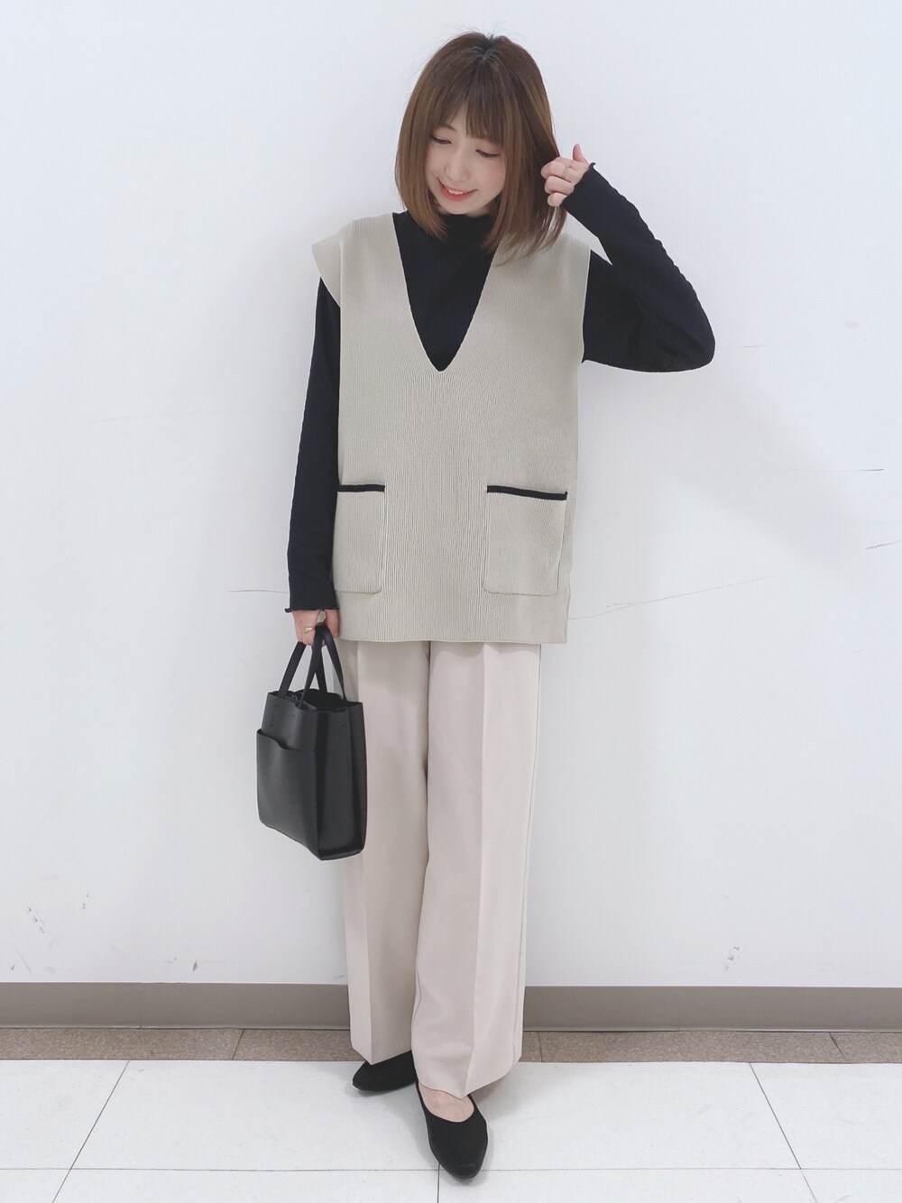 こんばんは、 ご覧いただきありがとうございます★ いいね、お気に入りありがとうございます🙏✨ フォルダインもとっても嬉しいです😊 ・・・・・・・・・・・・・・・・・ 上下のトーンを合わせた セットアップ風スタイル♪ ・・・・・・・・・・・・・・・・・ 🤍スポンディッシュVネックニットベスト 🖤しぼ感シアーハイネックインナートップス 🤍サイドタブ付きストレッチワイドパンツ ニットベスト♡ 幅広いスタイルで活躍してくれるニットベスト! 抜け感のあるゆるシルエット。 深めのVネックが今年らしいデザインです。 ポケットと裾に入れた配色使いがアクセントになっています。 インナー♡ シアーのハイネックプルオーバー。 ハイネックデザインなのでインナーとして首元だけ出したレイヤードスタイルもおすすめです。 パイピング部分はフェミニンなメローデザイン。 パンツ♡ ウエストのタブデザインがポイントのワイドパンツ。 センタープレス入りで脚長効果◎ ウエスト後ろはゴム仕様で楽に穿けるのにすっきりとキレイ目なシルエットです。 WORLD online Storeにも沢山のコーディネートを載せてます♪ →プロフィールの🖥をチェック👈