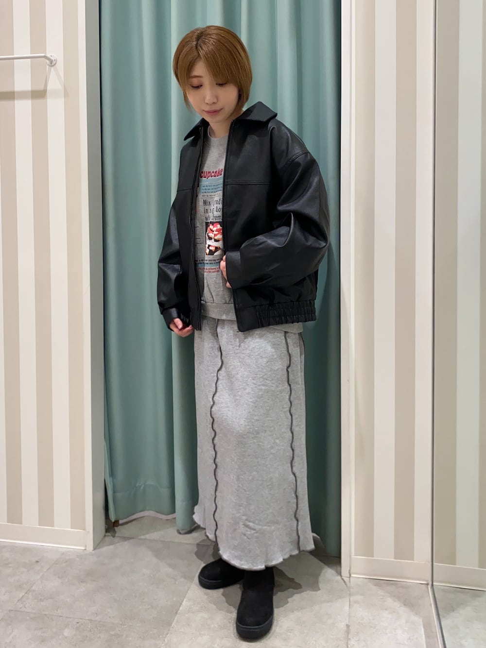 上下スウェットの楽ちんコーデ♪ レザー調ブルゾンを合わせて、ラフになりすぎないよう仕上げました。