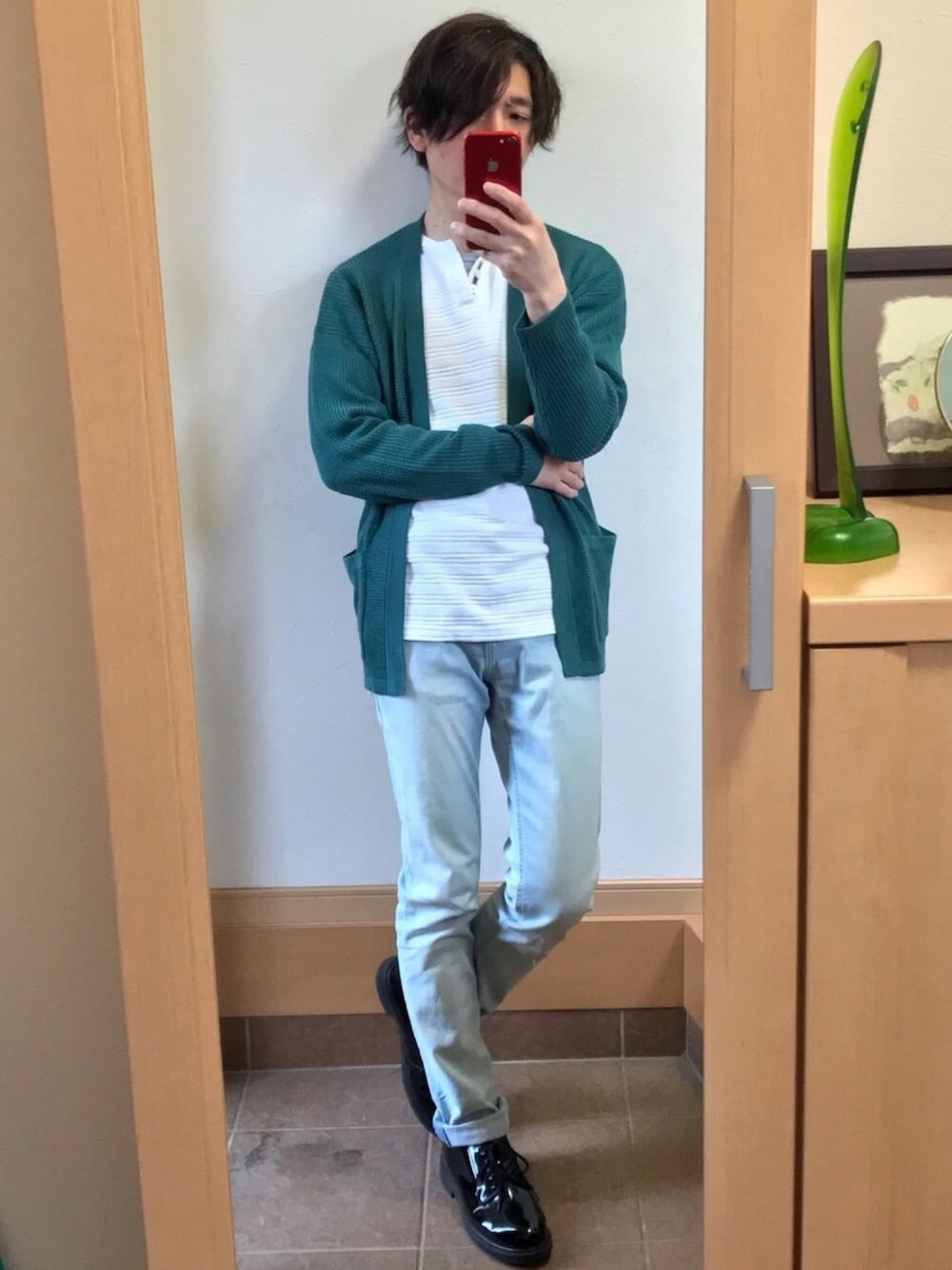 シンヤのカーディガン/ボレロ「◆【手洗いOK】ワッフルVネックニットカーディガン」を使ったコーディネート