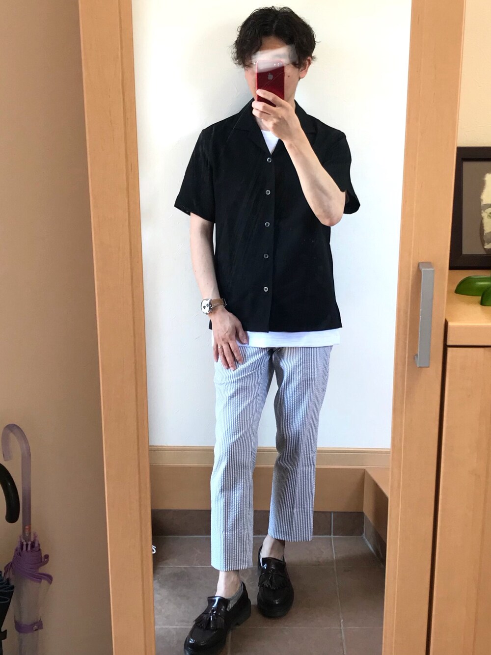 こんばんは。観覧ありがとうございます😆 ニューアイテムを何点か購入したのでアップしました✨ 黒のオープンカラーシャツにストライプのサッカーパンツで、爽やか夏コーデです。 良かったら、いいね、お気に入り、フォローなどお気軽にどうぞ〜💫