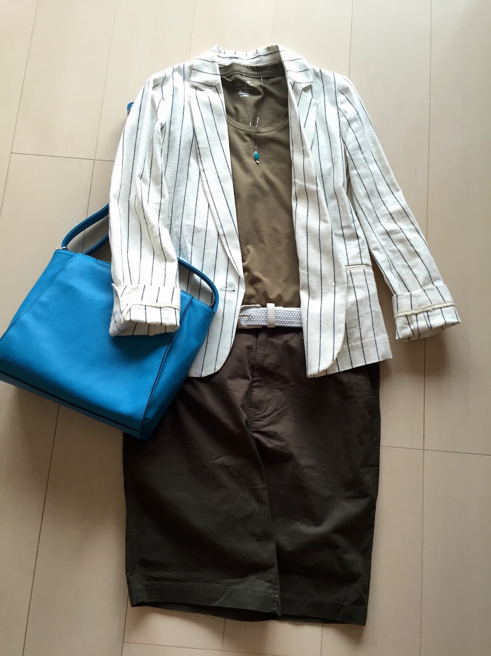 オールGUコーデ。久し振りにGUへ行ったら使えそうなセール品をゲット。リネンブレンドの白ストライプジャケットは1,990円。カーキTは990円、白ベルト990円、チノショートパンツ(メンズ)790円。他にもあと2点程購入。掘出し物探しはやめられない☺️