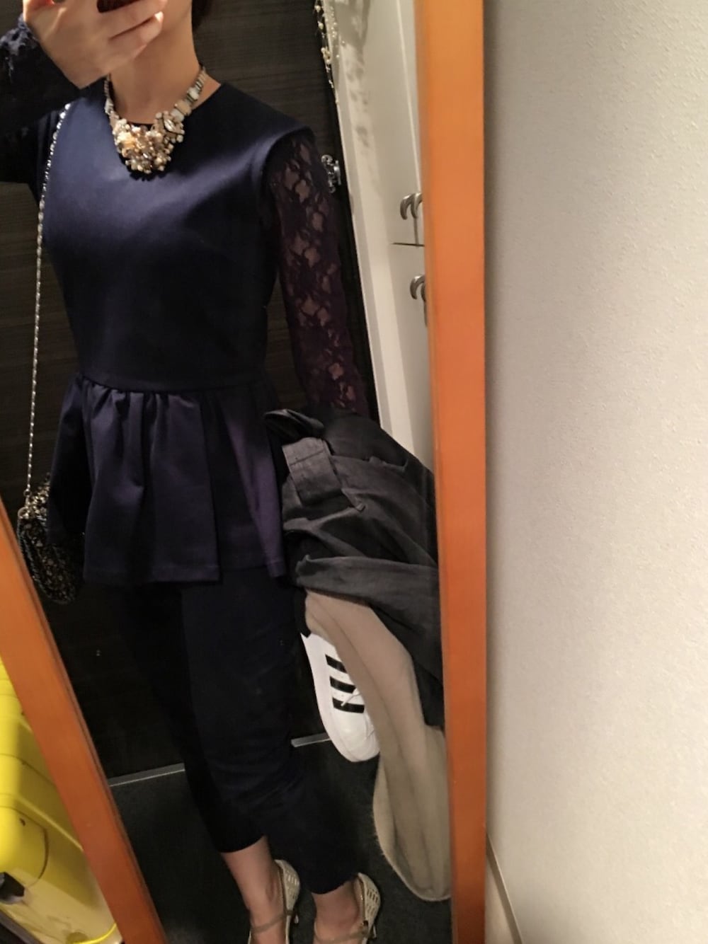 友達の結婚式コーデ パンプスは足痛くなるからこっそりスニーカー持参。というか会場近くまでスニーカー。3次会でギブアップしてスニーカーで過ごした笑
