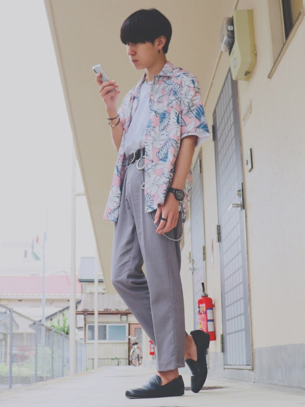 白×黒×グレーのモノトーンコーデにピンクのアロハシャツで差し色入れてみました😊 ピンクの可愛らしい印象を、ベルトとシューズに黒レザーのアイテムを投入する事で中和してます👏
