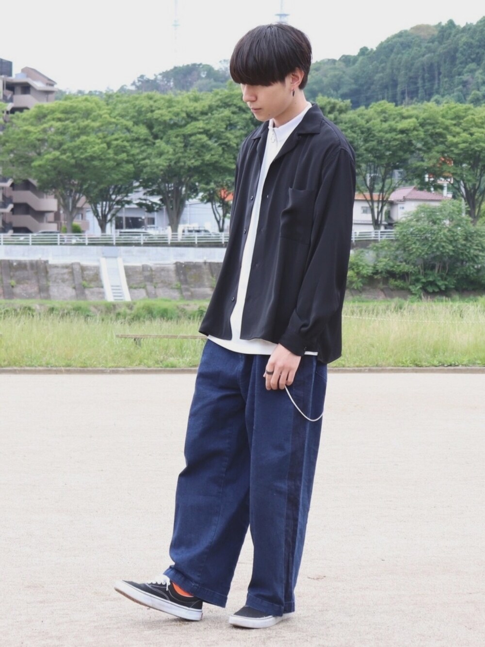 今回は羽織ありと無しでコーデ組んでみました😁 寒くて長袖シャツ羽織ってます👔(笑) 差し色はオレンジのソックスで🍊 羽織無しの方は、ジップ全開でインナーとアクセ見せスタイルになってます‼️ 是非見てくださいね😊