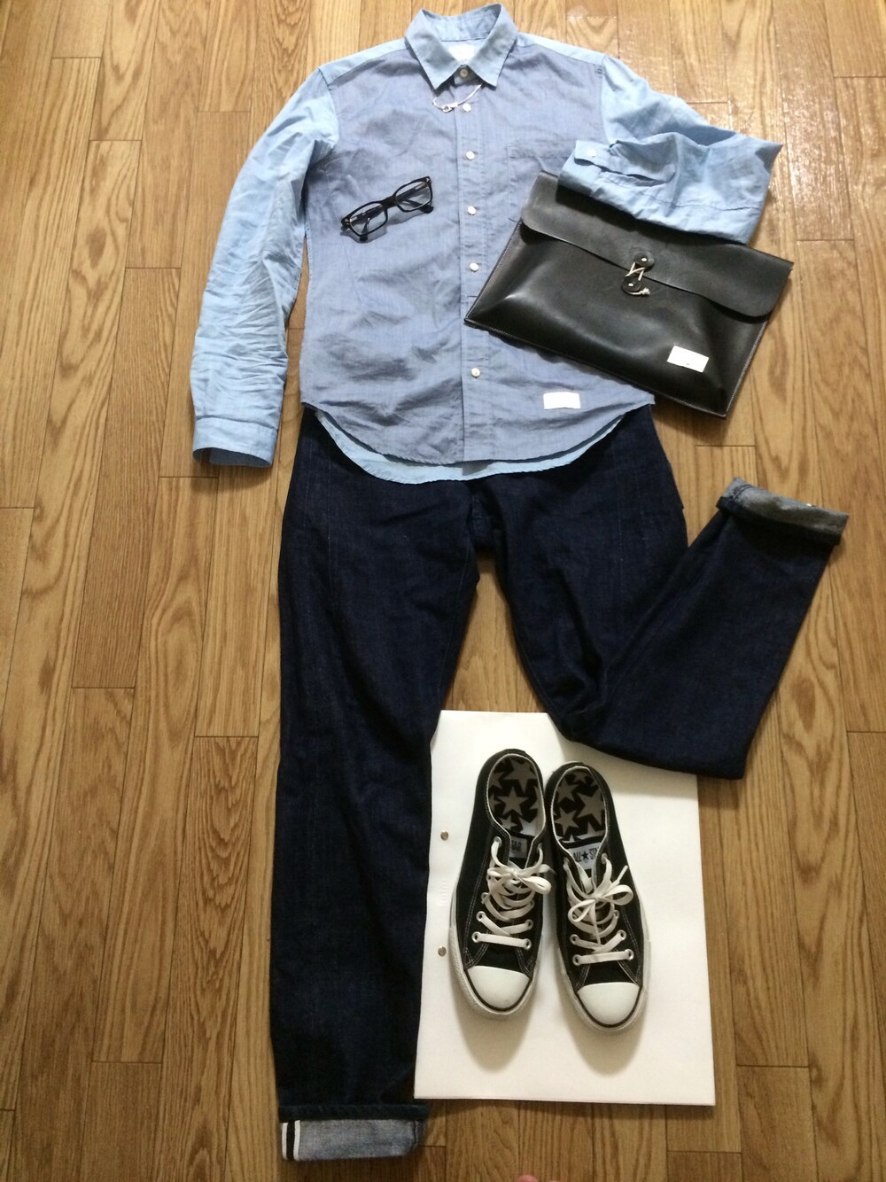 先週末のコーデ。シンプルコーデ。 長袖シャツは腕まくりして着用。 メガネ、靴以外は Name.でコーデ。 Name.のこのシャツは、柔らかく、肌触りが良くて、光沢があり、最高❗️