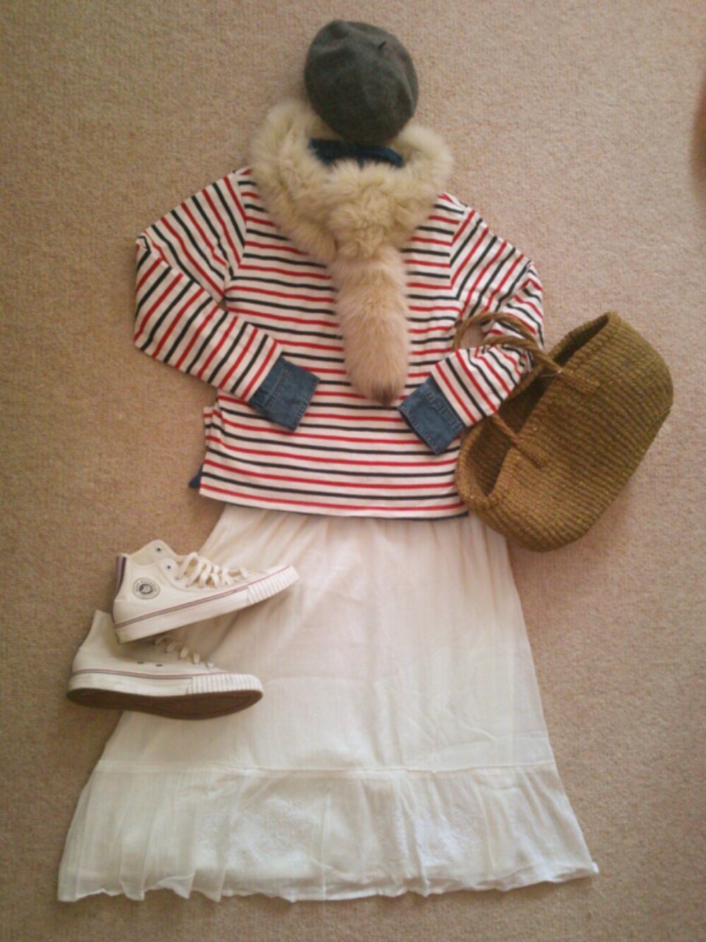 カットソー/e-zakka シャツ/coen スカート/coen ベレー帽/オクタホテル ファー/セレクトSHOP バッグ/輸入雑貨店 シューズ/niko and... 結婚式用に買ったフォックスファー タンスの肥やしは勿体無いので