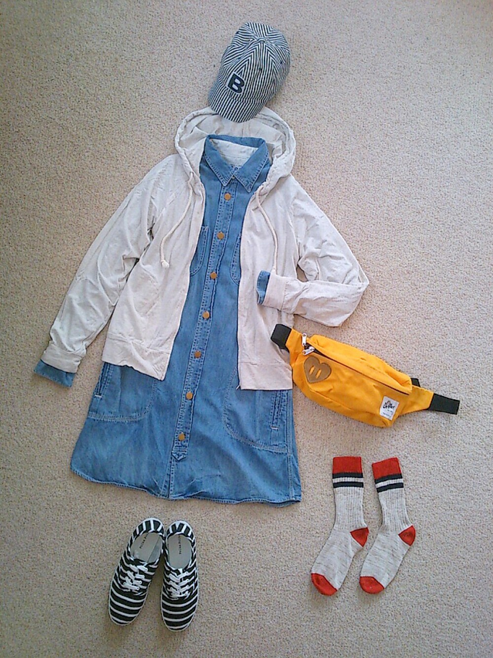 ワンピース/Lee×ROSSO パーカー/e-zakka キャップ/niko and... バッグ/Drifter ソックス/coen シューズ/雑貨店 雑貨店で見つけたプチプラのスウェットボーダーシューズ!使える♪