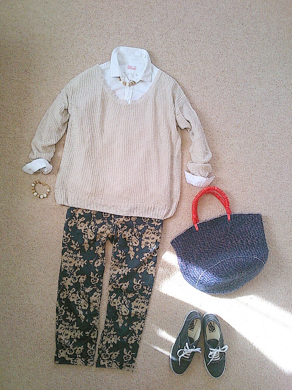 ニットプルオーバー/coen シャツ/coen パンツ/LEPSIM ネックレス/octa hotel ブレスレット/octa hotel バッグ/niko and... シューズ/vans 髪はアップでお団子に。 新しい花柄パンツ欲しいナ~