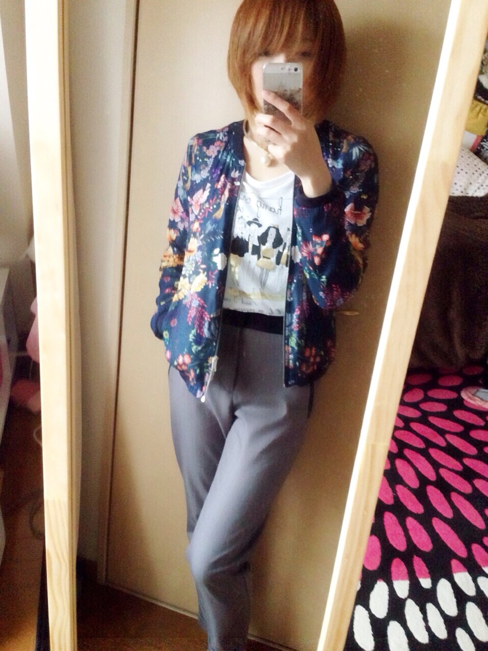 柄物ブルゾンに白のロンT。