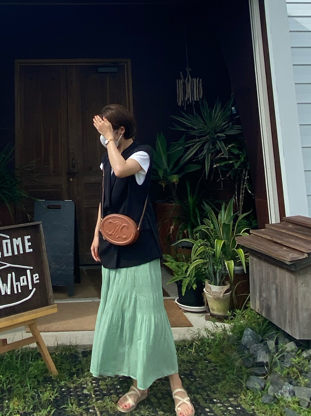 ミントカラーのスカートをメインにし、Tシャツのみだとシンプルになりすぎるのでベストも取り入れてみました!!