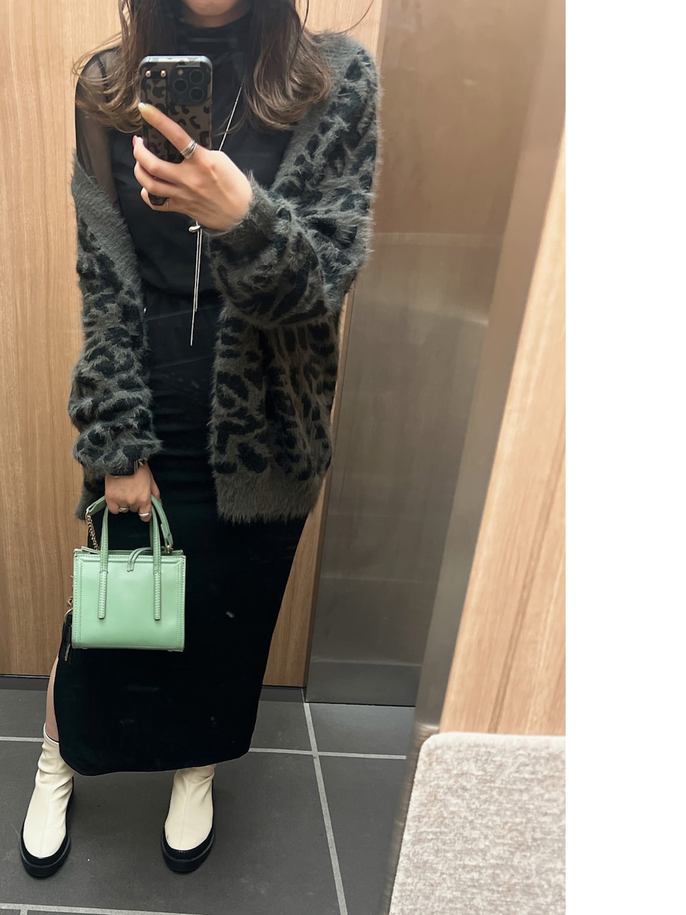 豹柄のカーディガンが主役の シンプル派手コーデ。 中はシースルーカットソーで薄着だけど シャギーっぽいカーディガンが ちょうどいい季節になりました🍁