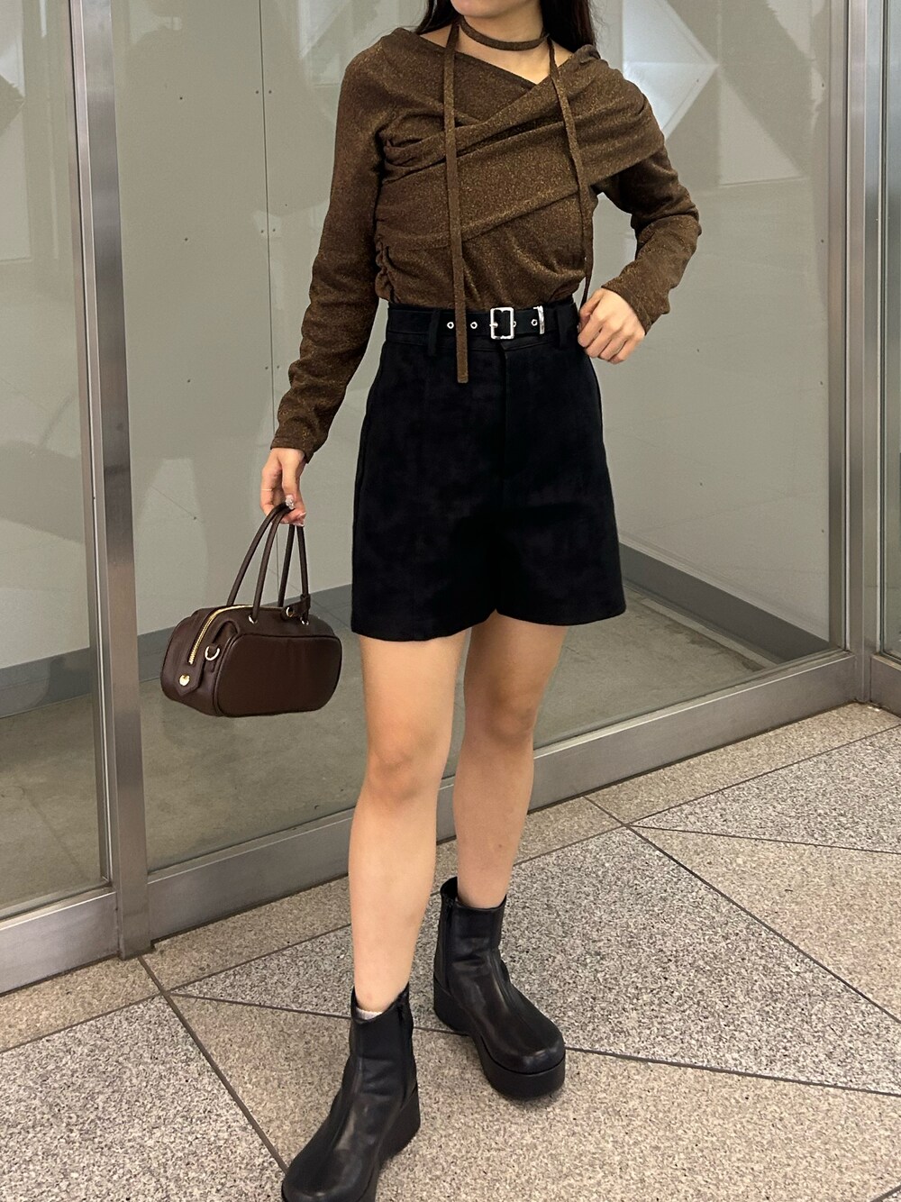 トップス】 チョーカー付オフショルデザインニット キラキラのラメがかわいい🌟 オフショルでも肩を落とさずにも着れます◯ チョーカーがついているので首元も寂しくなくワンポイントに☝️ 【パンツ】 レザーハーフパンツ ベルトで高見え&ハイウエストなので脚長効果 ストンとしたシルエットが可愛い 【バッグ】 ヨコナガボストンバック オールシーズン使うことができるバッグです!!500mlのペットボトルが入ります!! 【ブーツ】 2wayカバーロングブーツ ショート・ロングで履くことができます。 ベルトデザインでサイドのシルエットも可愛い🫧