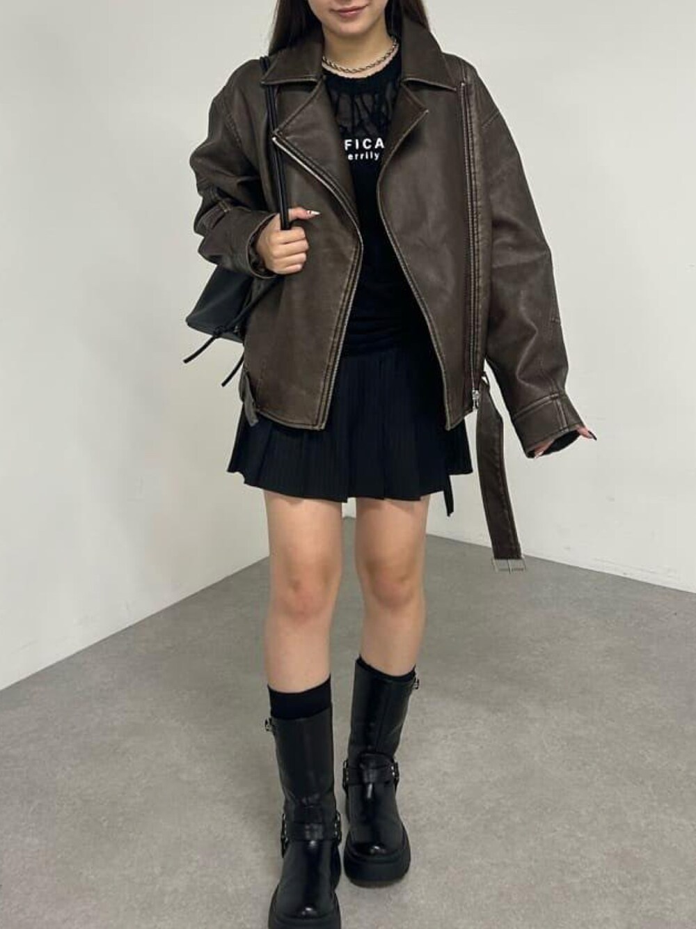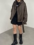 【outer】 ムラレザーライダースジャケット 襟のボアを取り外しできるブルゾン 取り外して、辛めに着用しました○ スッキリして見えて、綺麗にまとめたい方は外して着用がおすすめ○ 丈感も158cmでおしりくらいなので、冬のミドル丈のニットは気にせず着用できます○
