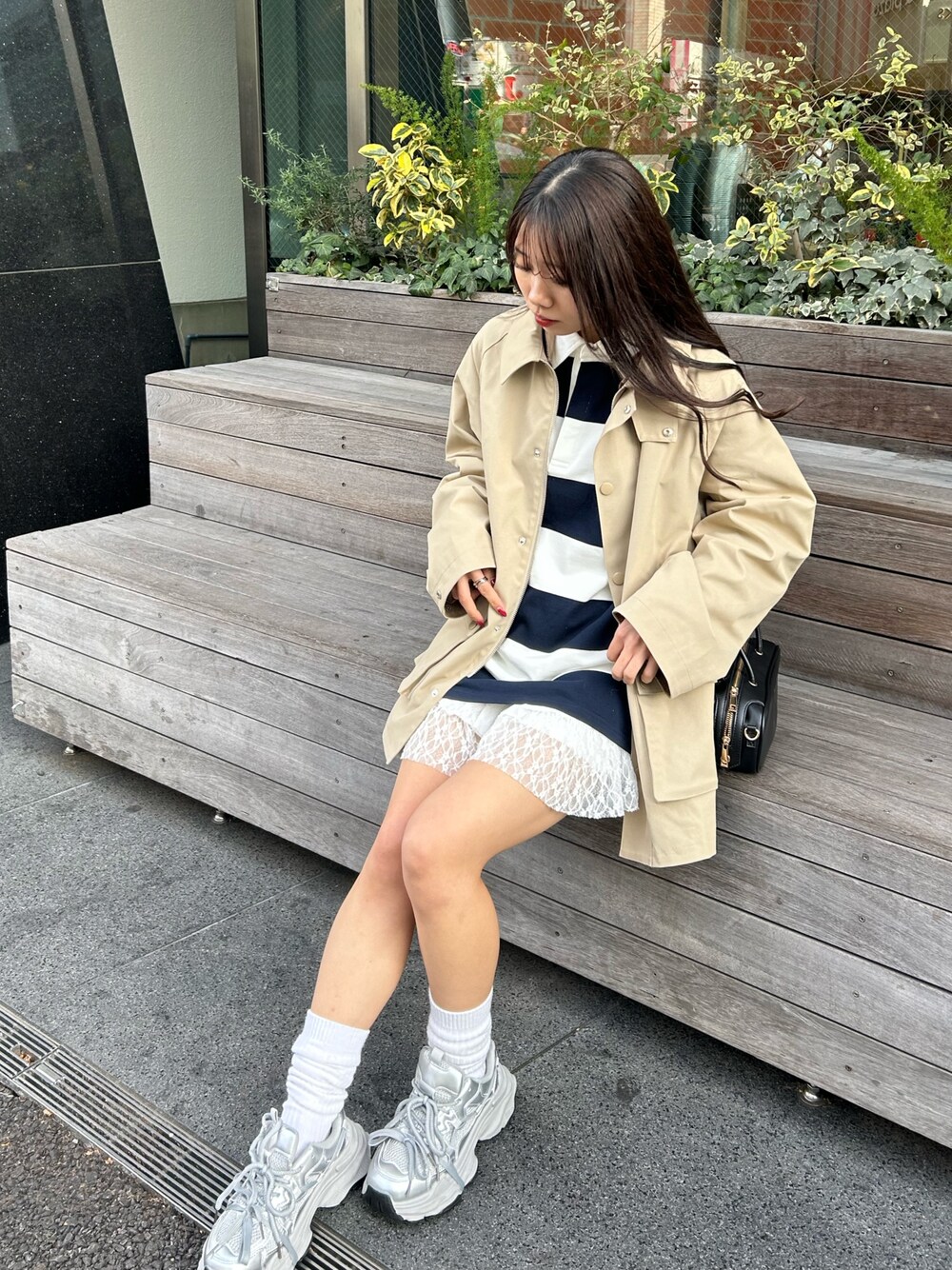 【ジャケット】 さらっと羽織れるジャケット★ ミドル丈なのでミニスカートにロングブーツ・スニーカー合わせも〇 デニム合わせでカジュアルにも〇 【トップス】 ボーダーは苦手意識があり避けてきましたが、、 このトップスは膨張することがなく、いいじゃんと思いました。 襟元がゆったりとしているので苦しくないです。 ミニ丈合わせでもデニム合わせでも似合う最強トップスです。 【スカート】 ペチパンが付いており安心です〇 下部分がレースのように透けているので分厚いトップスに合わせても重たくならず軽い印象に 【スニーカー】 厚底でスタイル爆漏れします。 軽いのでたくさん歩いても疲れません ミニスカートにソックス合わせで海外ガーリー風にも🙆♀️ 【バック】 五百ミリリットルのペットボトルが入ります。 型崩れの心配もなく、オールシーズン使えます〇