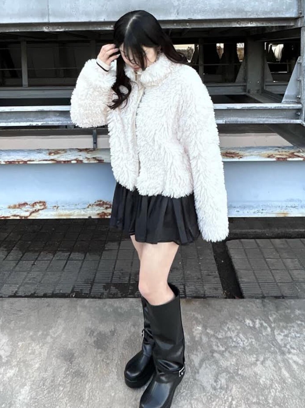 ★今流行りのボアアウターです! チャックの所がレザー素材なのでボアが挟まることなく開け閉めがしやすい!! しかもめちゃくちゃ軽いです!!! ★skirt シアー素材で2枚生地が重なっているので揺れると少し透ける感じがかわいい! ウエストがゴムなので履きやすいです!! ★boots 中がショートブーツになっているので2wayで履くことかできます! 厚底になっているので身長も盛れる&細見え効果もします!