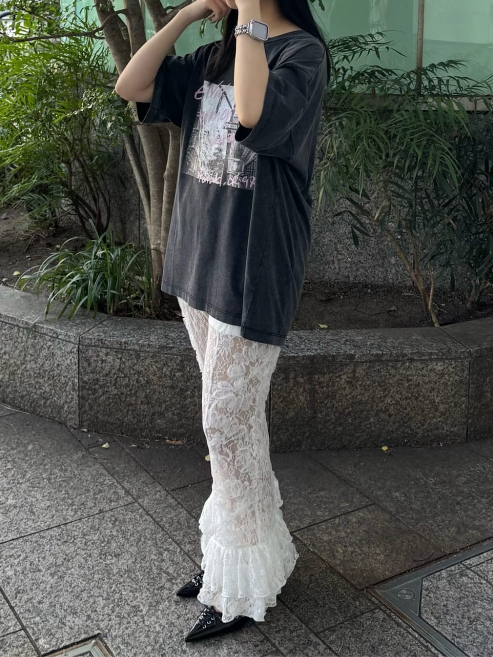 【tops】 グラフィックプリントやロゴのピンクカラーが目をひくTシャツです♪ 身幅はゆとりのある大きめシルエットで袖も肘くらいの長さまであるのでオーバーサイズが好きな方におすすめです! 【bottom】 レース素材が涼しげなトレンドライクのフレアパンツ。インナーパンツも付いているので透け感も気にならずに安心して履けました!腰回りが隠れる長さのトップスと合わせることでより脚が細くみえます。身長151センチでフラットなシューズで合わせても丈が長すぎず履くことができましたよ! 【shoes】 シンプルなデザインですがつま先のレースアップデザインが大人っぽいミュールです。 低めのヒールなので長時間履いても疲れにくいです◎23.5センチで38サイズがぴったりでした!
