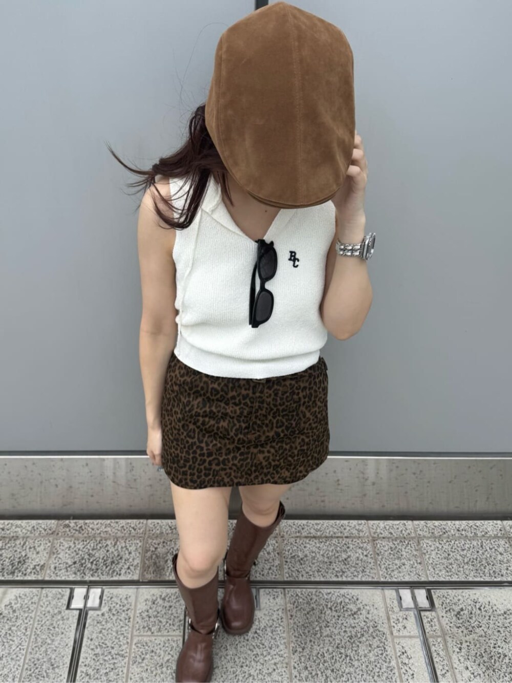 【tops】胸元のワンポイントが可愛いこちらのトップスはサマーニットで夏でもさらっと着られますよ◎ 【skirt】ミニ丈でも安心して履きやすいパンツ付き!ベルトが付いているのでウエストがすっきり見えます! 【shoes】コーデのアクセントになるごつめのバックルデザイン!足元にボリュームが出てミニボトムとの相性抜群♡ヒールは高くないため軽くて歩きやすいですよ! 【goods】スエード素材で秋っぽさも先取りできるアイテムです⭐︎後ろにボタンが付いているのでサイズ調整も可能。