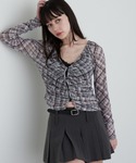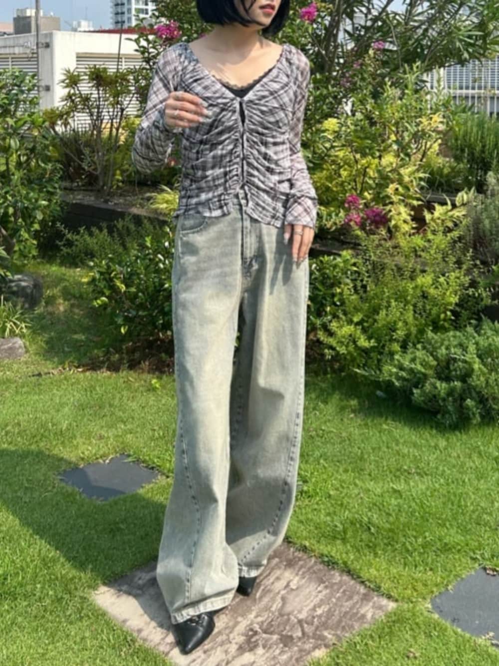 《トップス》 チェックシアーの透け感とレースのインナーがトレンド感たっぷりで可愛い☺︎ トップスとインナーがセットアイテムなのですが、別々に着回しコーデができちゃいます! 首元がゴム仕様で調節が出来るので、肩や首を出した方が盛れる骨格の方はオフショルぽくキルのオススメです!! 《ボトムス》 ウエストはピタッ、裾に向かってダボッとしたシルエットでメリハリがスタイルアップを叶えてくれるデニムです! ウエストは2段階で調節出来るのも嬉しいポイント♡ ヒップ、太もも周りをカバーしたい方にもおすすめしたいです〜