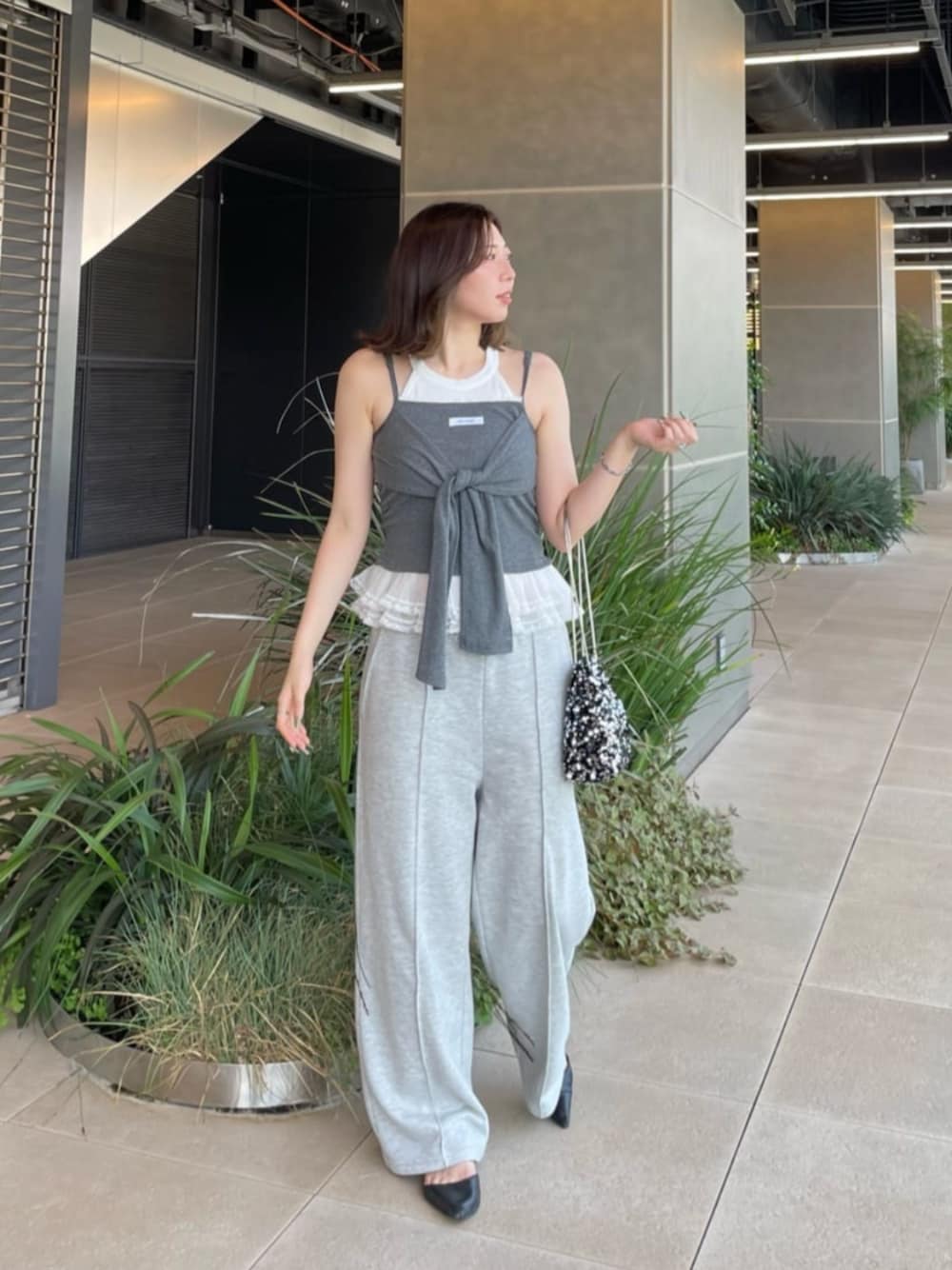 骨格ストレート/159cm 《トップス》 着用…フリーサイズ 前後2way対応◎レースを前にして甘めにも、反対でシンプルキャミでも着れます!前の結び目は好きな位置で好きな結び方ができて、とにかくインパクトある、主役級の新しいキャミソール!夏は一枚でサラッと着るのが可愛い◎実は秋冬も、下にロンTやシアートップスをいれてあげると可愛くて、オールシーズン着れちゃいます! キャミ着たいけど、二の腕気になるな…って方も、これだけインパクトあるリボンがあれば!視線も気にならない✨ 《ボトムス》 着用…フリーサイズ だる着、部屋着になりがちなスウェットパンツの概念が覆されるボトムス!その理由は、縦ラインが入っていてスラックスの形で作ってるので、ブラウスや綺麗めなトップスとの相性も抜群!さらに、レースのインナーパンツがついてて、取り外しもできるので、レースレイヤードを他のボトムと合わせて履いても可愛い◎