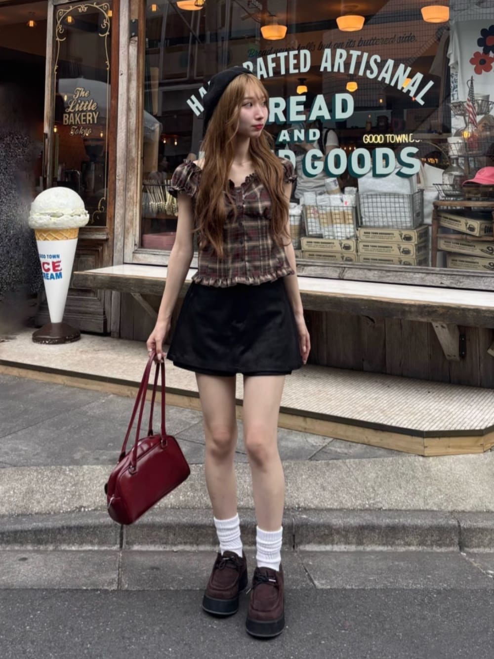 暑い夏から着れる秋先取りコーデ♡ ・トップスがコンパクトな作りなので、ミニもロング合わせも◎ ・オフショルっぽく肩落として着ても可愛いよ◎