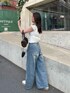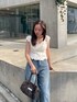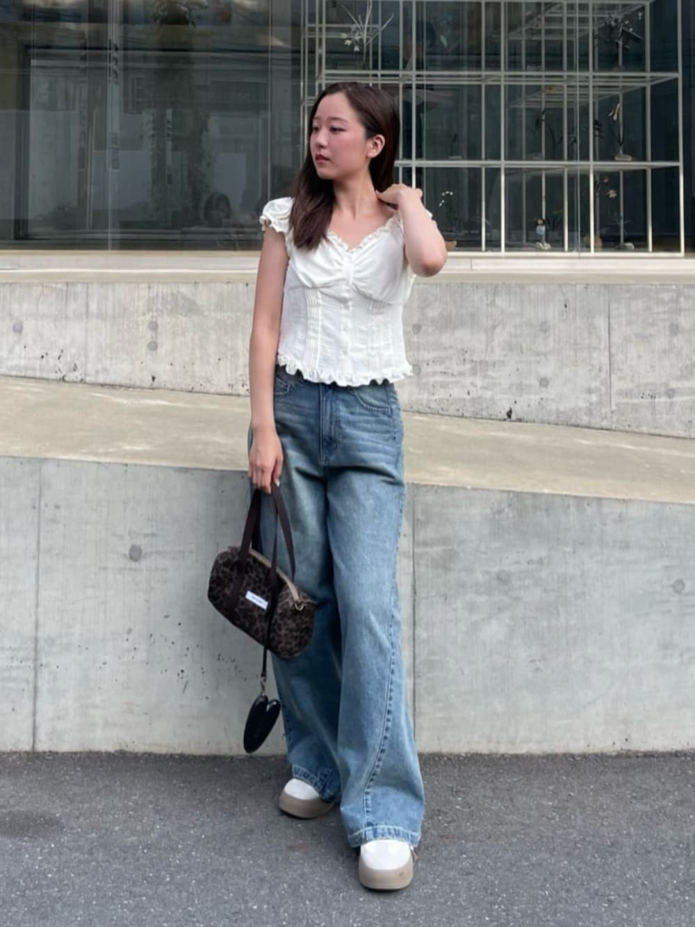 【ブラウス】 シンプルなデニムにも映えるブラウスです🤍 袖部分は肩隠しても良し、ガッツリ下げてオフショルっぽくもできます◎ 丈感は160cmでウエストジャストくらいです!