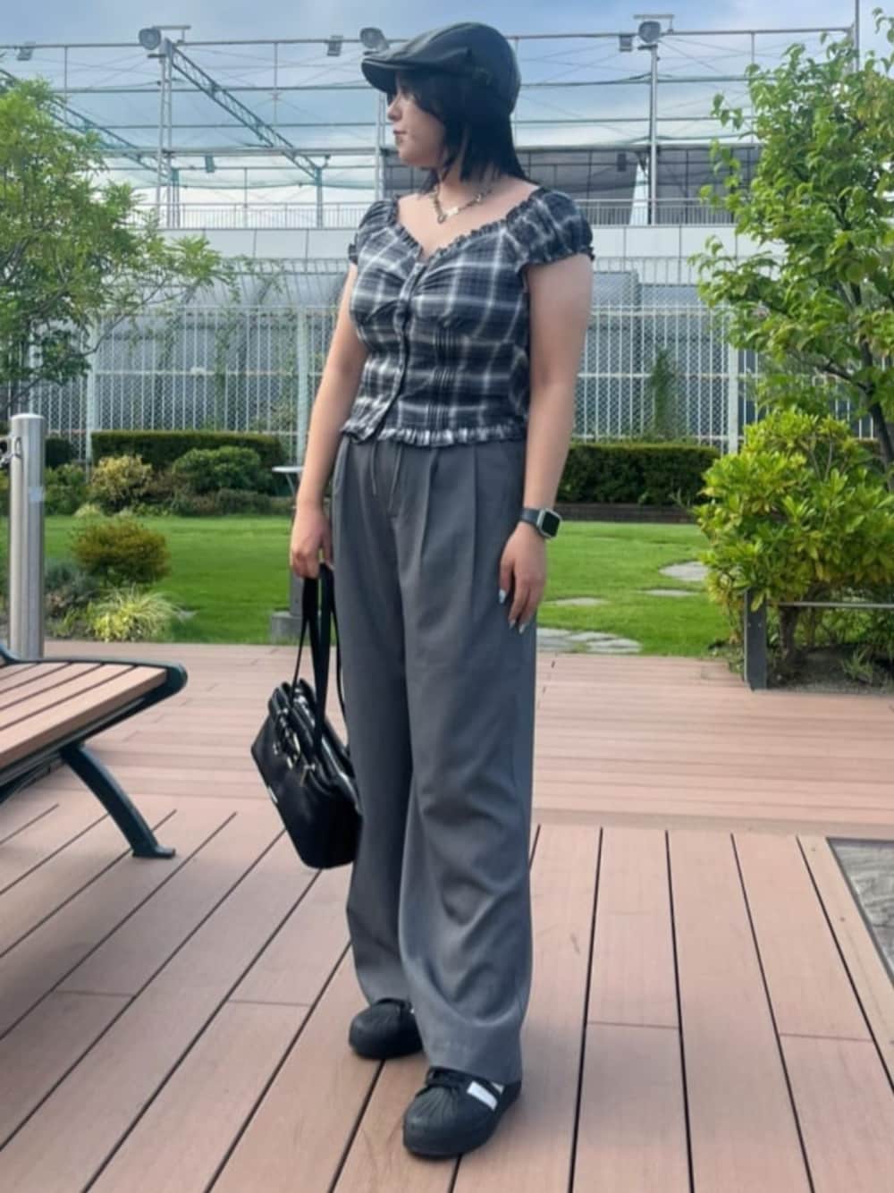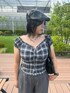 【TOPS】 素材は暑い日でも着やすく薄手ですが、チェック柄やアイボリーなどで秋を感じるコンパクトブラウスです⋆* 首周りがゴムになっているため肩を落として、オフショルとしても着られます! 二の腕も隠せるのも嬉しいポイントです✦.°