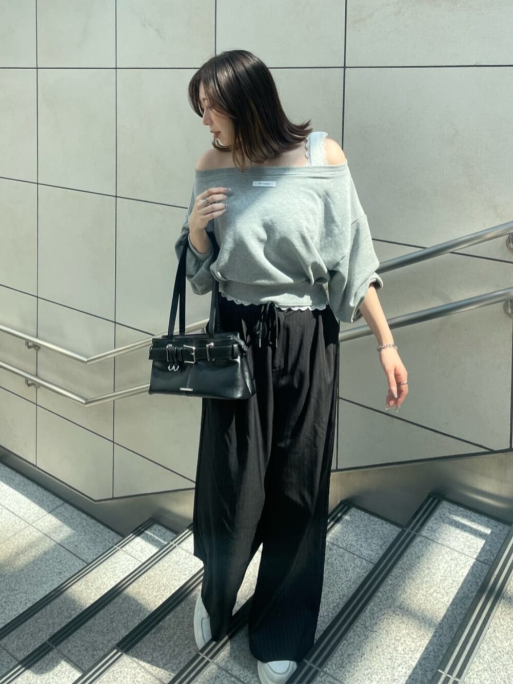 《トップス》 着用…フリーサイズ たぽっとした袖感が可愛いのと、肩紐のレースがワンポイントになって可愛い!細すぎないので下着感も出ず、しっかり存在感◎ スウェット素材ですが、全くダル着感出ません!!! 前後2wayで使えるので、胸元のロゴを後ろにしても前にしても◎ 《ボトムス》 着用…フリーサイズ スーツ素材でできていて、綺麗目にも着れるし、スラックスだけどゆったりシルエットなので、Tシャツとか合わせてカジュアルにも◎ スラックスなのに軽量でゆったり着れるのが推しポイント! 159cmの私はフリーサイズでゆるっと感出すのが好きです◎ 《バッグ》 500mlのペットボトルがすっぽり入るのに、見た目はコンパクトで可愛い◎シンプルなデザインだから、どのシーンでも使いやすい!肩紐部分が長くできているので肩掛けもできちゃいます!