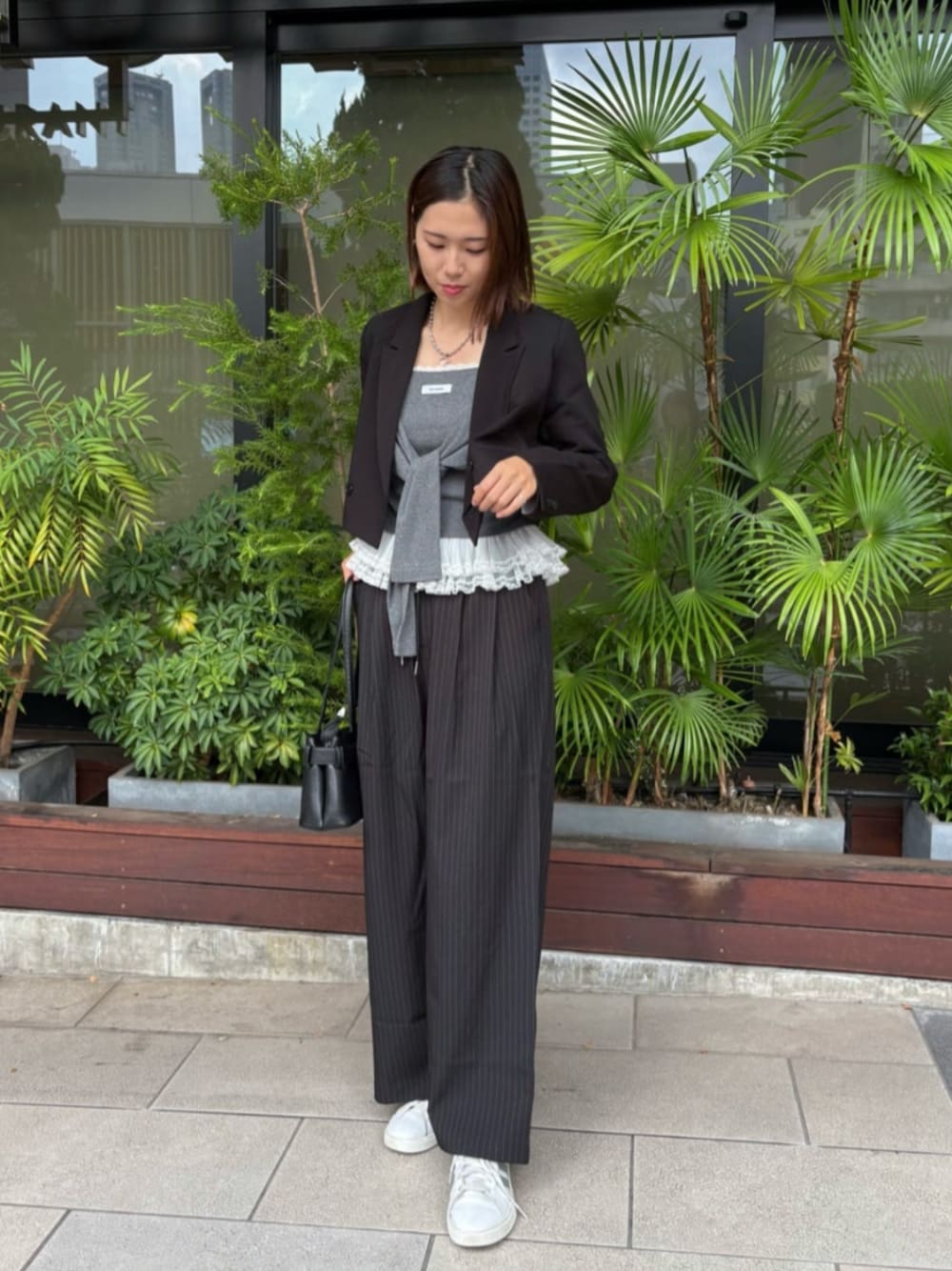 【ジャケット】 短丈のためスタイルアップが狙える1着! とても軽いので着心地抜群です! スタイルを盛りたいあなたにおすすめです! 【キャミソール】 レース部分が可愛い! 前でリボンを結んでいますが、このリボン着回しアレンジ抜群なんです! 中にシアーの長袖を着たり、半袖のTシャツでもありです!長い期間着れるのがこのキャミのいいところです◎ 【スラックス】 171cmフリーサイズ着用 丈感たっぷりなのがとてもかわいい! ウエストはボタンand紐がついていて、調節がしやすいです。 ワイドパンツでゆるっとしていますが、重く見えずむしろスタイル良くみえるのが嬉しいです◎