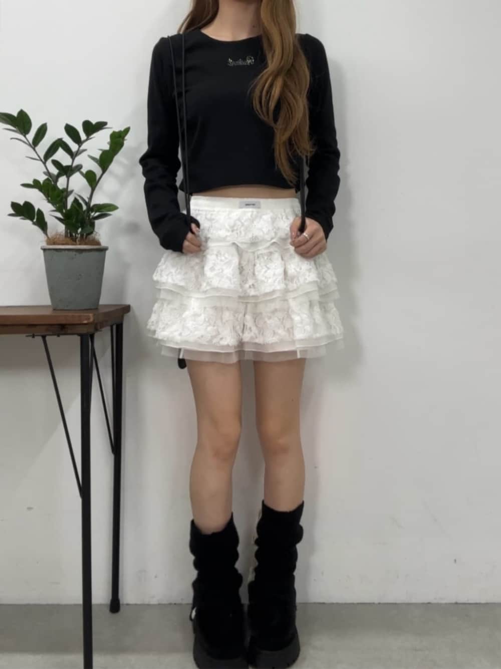 ウェーブ大優勝コーデ✴︎ 【Tops】コンパクトなサイズ感が着痩せのポイント! ・ラメストーンがワンポイントになって、シンプルすぎず、派手すぎず着回しやすさ◎ ・ラメストーンのロゴの位置も高い位置にあるので、上からベストや、パーカーなど重ね着しても見える位置になってます。 ・サイドと、腕部分のくしゅくしゅもデザインが可愛い◎ し、それだけじゃなく、ピタッと体にフィットして着用できるので着痩せも◎ 【Bottoms】たっぷりレースを使った高級感あるスカパン! ・スカートに見えて、パンツなので、丈が短くても安心! ・裾にかけて広がるデザインなので、スカパンと足の間に隙間ができてより足が綺麗に見えます◎