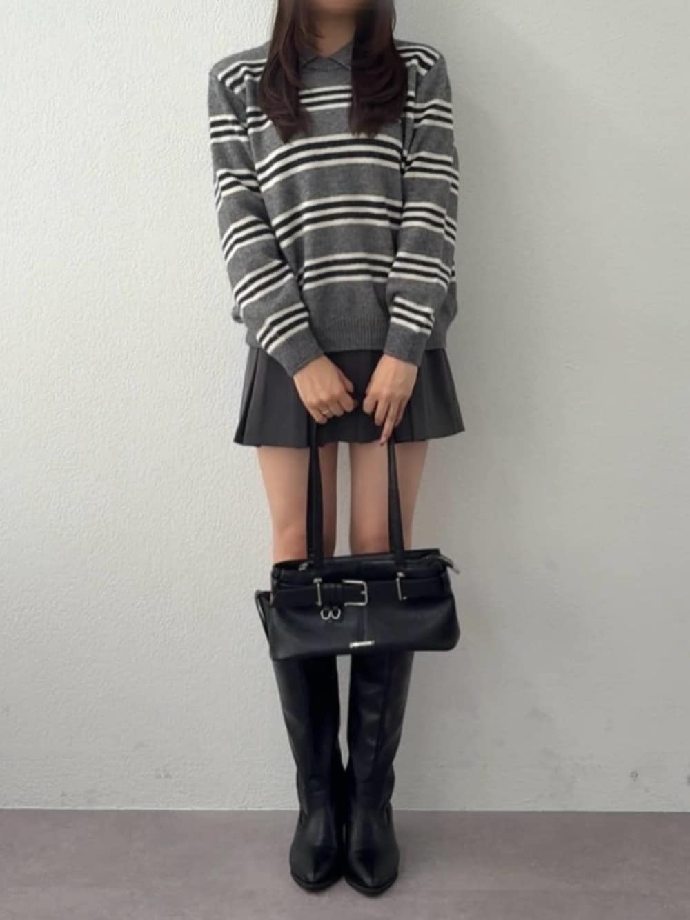 【トップス】 color : グレー ボーダー柄の襟付きニット。 裾がリブになっていて広がらないシルエットが骨ストの着痩せポイント! ボトムスはロングでもミニでもバランスよく着れる丈感です◎ 【ブーツ】 color : ブラック つま先の尖りがコーデのアクセントになるロングブーツ。 筒の部分が太くて足元にボリュームが出るデザインなので、太ももが細く見えるシルエットです◎