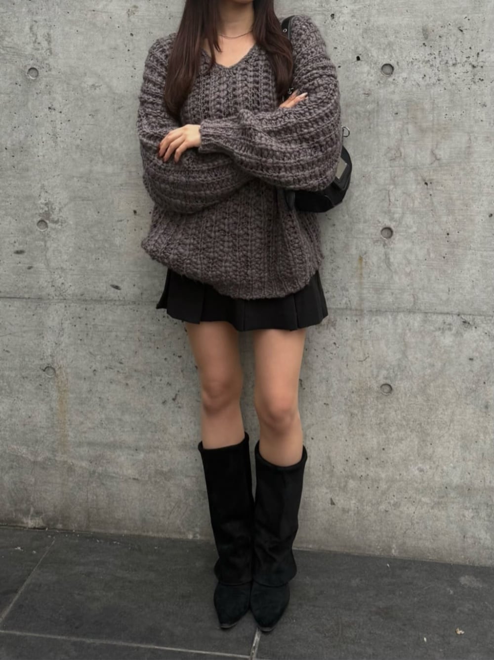 【トップス】 color : チャコールグレー ルーズなシルエットが可愛いチュニック丈のニット。 お尻がすっぽり隠れる丈で、首元がVネックなので、オーバーサイズが苦手な骨ストでもスッキリ着用できました。 ロングボトムスを合わせる場合は、細身のフレアデニムがおすすめ◎ 【ボトムス】 color : ブラック シンプルでどんなトップスにも合わせやすいプリーツスカート! プリーツのはじまる位置が低いので、広がりが控えめで、腰回りのボリュームが抑えられるのがお気に入りポイント★
