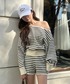 【トップス】 ワンショルですが、肩を合わせて着用すれば、鎖骨が広めに見えるくらいで着られます。 ワンショルで着る際はチューブトップなど着用するか、レースキャミなどを着て肩からレースの紐を見せても可愛いです。 ボーダーのピッチが狭いので派手に見えすぎないのと、体が太く見えにくいです。 【ショーパン】 コンパクトなデザインですが、ほどよくゆとりもあるのでボディラインを拾いすぎずに着用できます。 タイツ×ロングブーツや、タイツ×スニーカーやローファーなどで大人っぽく着るのもオススメです!