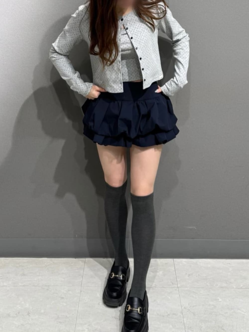《トップス》 細かめのドットが甘すぎなくてかわいい! 着ていただくと、ストレッチきいた素材で伸びるので着心地も◎ キャミは肩紐アジャスターあるので長さ調整も可能です。 《バルーンスカート》 ボリューム感がかわいすぎる! バルーン×ティアードのハイブリッドは意外となくて特別感があります。 インパンは下からチラッとレース見えるデザインだから見せてあげるのが可愛い☺︎︎ ネイビーのカラーはコーデが甘めになりすぎなくておすすめです◎