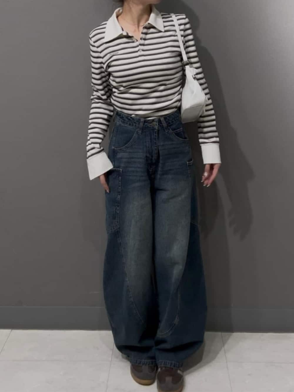 《トップス》 着痩せ効果抜群のトップスです。 ウエスト部分だけでなく、脇下からシャーリングが入るので着膨れせずに着られます! インしてもインしなくても綺麗なシルエットで着用いただけます。 《デニム》 脚長効果抜群のデニムです。 サイドのポケットはデザイン性だけでなく、隠したいところのカバー力もあって細見え間違いなしです!